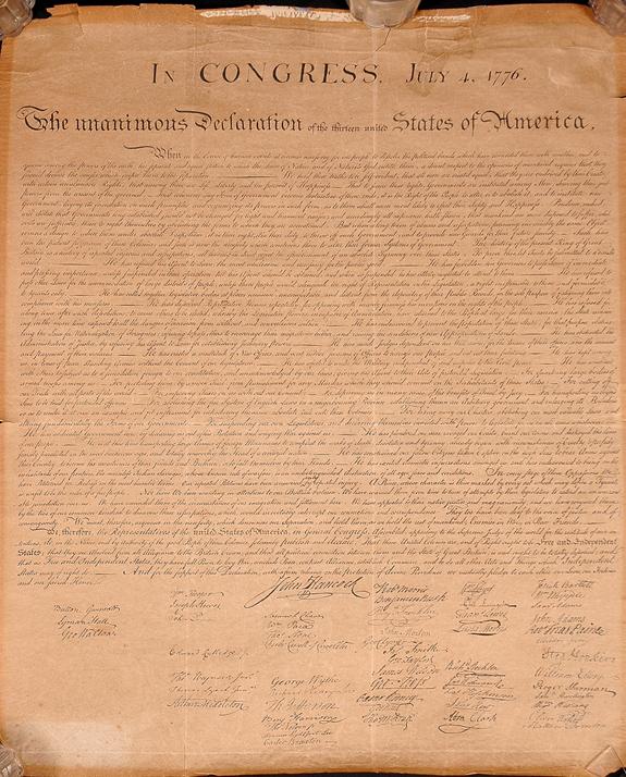 This rice paper copy, from Peter Force's American Archives, measures 31 x 25½ inches. Since Peter Force used Stone's copperplate, "W.J. Stone S.C. WASHN" is engraved below the first row of names. This copy of the Declaration is toned all over and has some edge tears which are presently being treated by a conservator from the Huntington Library (paid for by the consignor); the treatment will be finished by May 11. These Declarations are extremely desirable. The last several copies to come on the market have sold for over $30,000.