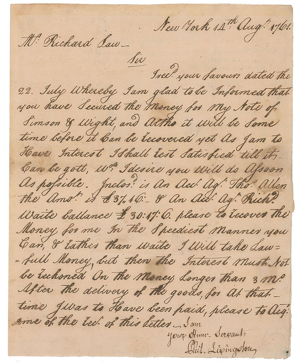 Signer of the Declaration of Independence from New York (1716–1778). LS signed “Phil. Livingston,” one page, 7.5 x 9.25, August 14, 1761. Letter to attorney Richard Law. In part, “I am glad to be Informed that you have Secured the Money for My Note of Simson & Wight, and Altho it will be Some time before it Can be Recovered yet As I am to Have Interest I shall Rest Satisfied till it Can be gott." In addition, he sends two bills for outstanding payments and asks that Law "Recover the Money for me In the Speediest Manner you Can, & Rather than waite I will take Lawfull Money." Reverse of second integral page bears an address in Livingston’s hand, along with docketing notations in unknown hands, one apparently taken from the diary of John Adas. It reads, “Del.to Cont. Cong 1774–8. Phil. Livingston is a great rough rapid mortal. There is no holding any conversation with him etc. J. Adams Wash. 351 Diary.” Letter has been professionally silked. Aforementioned silking, scattered spots of light toning, and repaired paper loss to second page from wax seal, otherwise fine condition.