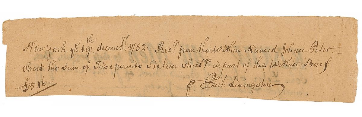 Signer of the Declaration of Independence from New York (1716–1778). ADS, signed “Phil: Livingston,” one page, 8 x 1.75, December 19, 1752. In full: “Recd from the within Named John Peter Obert the Sum of Five pounds Sixteen shillings in part of the Within Bond.” Signed at the bottom by Livingston. Show-through from text on reverse, light vertical wrinkling, and mild toning, otherwise fine condition.