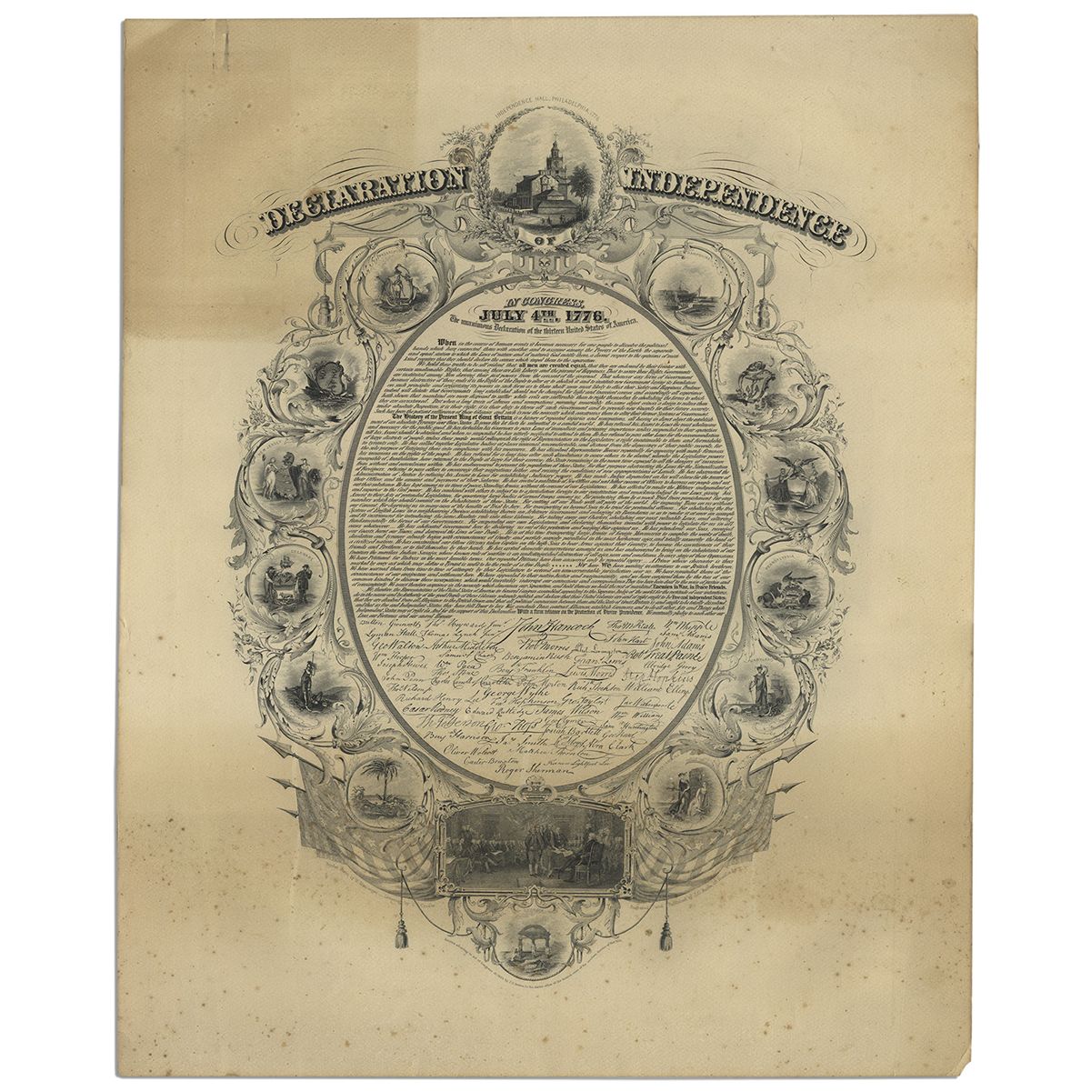 The Declaration of Independence print by J.C. Buttre, New York. Print from 1856 features the Declaration's text in an oval cartouche, surrounded by vignettes of the 13 colonies designed by W. Momburger. Measures 16'' x 20''. Foxing and toning, with toning concentrated at upper left, and paperclip imprint to top edge. Very good condition.