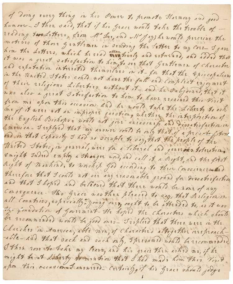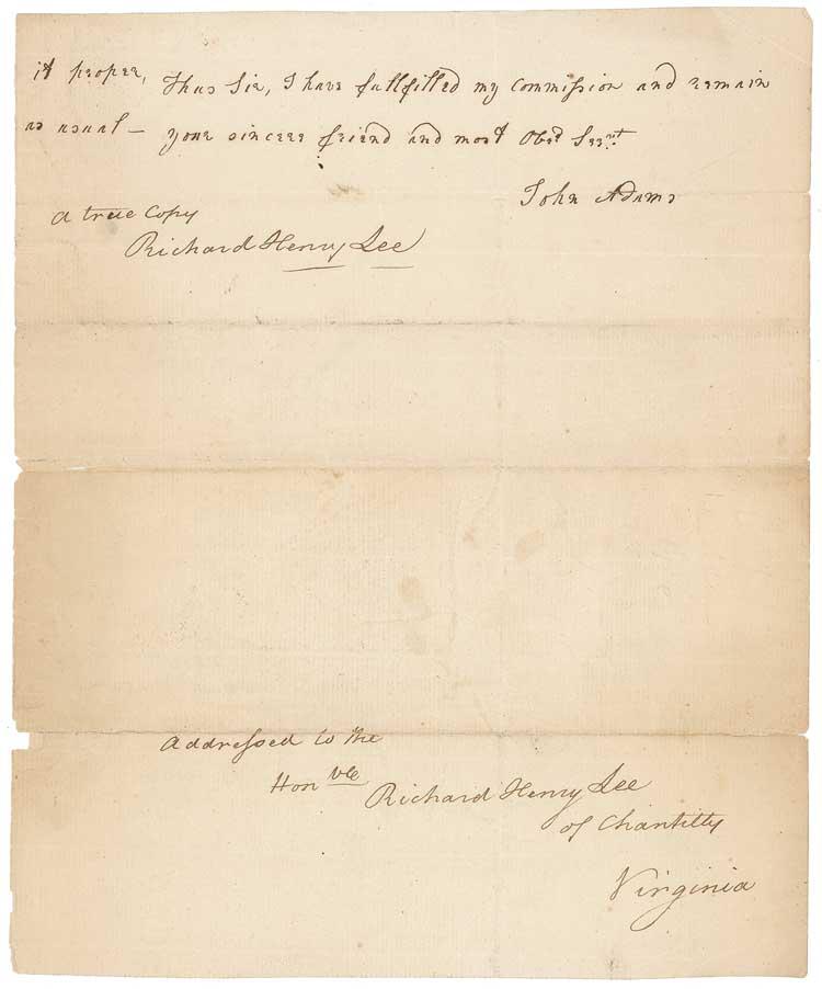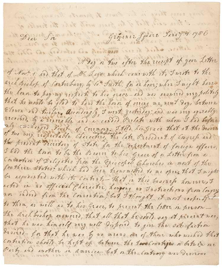 Contemporary transcription of John Adams’ January 4, 1786, letter from London to Richard Henry Lee, noted by Lee to be “a true copy, Richard Henry Lee” of the letter “Addressed to the Honble Richard Henry Lee of Chantilly Virginia,” three sides of pages, 7.25 x 9. Adams’ letter to Lee reads, in part: “I wrote to the archbishop of Canterbury…and was answered very politely that he would be glad to have the honor of seeing me…I had the honor to be the Bearer to his Grace of a Letter from a Convention of Delegates from the Episcopal Churches in most of the southern States…I acted in no official Character, having no Instructions from Congress nor indeed from the Convention….”