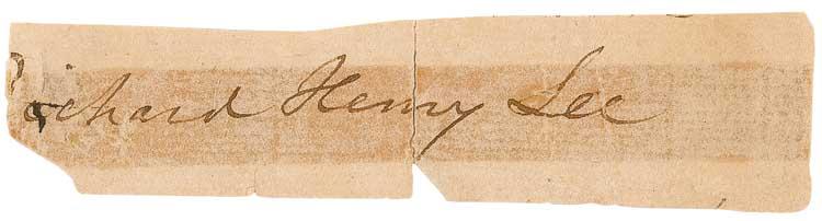 Signer of the Declaration of Independence from Virginia (1732–1794). Lee served as President of the Continental Congress, yet opposed the Constitution because it lacked a bill of rights. He served in the Senate and resigned after the Bill of Rights was added to the Constitution. Ink signature, “Richard Henry Lee,” on an off-white 4 x 1 slip. In good condition, with rough left edge resulting in missing first letter of signature, toning under signature from horizontal strip of tape on reverse repairing a complete bisecting vertical separation, and some light creases and wrinkles. In his 1995 reference History Comes to Life, Kenneth Rendell places Lee’s autograph material into the “rare” category among the Signers. Pre-certified John Reznikoff/PSA/DNA and RRAuction COA.