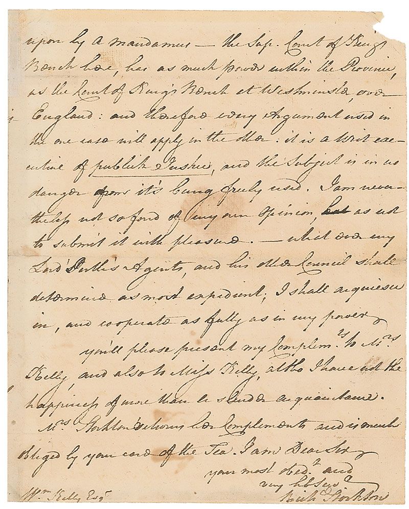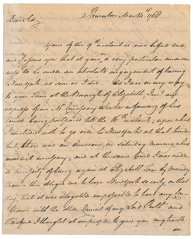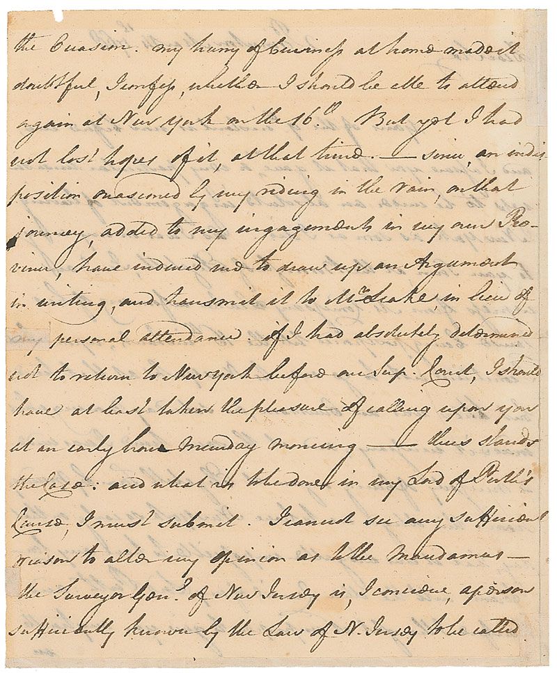 Very rare ALS signed “Rich Stockton,” three pages on two adjoining sheets, 7 x 8.75, March 14, 1768. Letter to William Kelly explaining why he had "to leave New York as soon as I did." In part: “I cannot see any sufficient wisdom to allow my opinion as to the Mandamus—the Surveyor Genl. of New Jersey is, I conclude, a person sufficiently known by the law of N. Jersey to be called upon by a Mandamus—the Sup. Court of Kings Bench here, has as much power within the Province, as the Court of Kings Bench at Westminster over England: and therefore every Argument used in the one case will apply in the other.” Scattered toning, separated hinge repaired with archival tape, and missing top right corner tip of second page, otherwise fine condition. Just the third Stockton we have ever offered, and the first ALS. In his 1995 reference History Comes to Life, Kenneth Rendell places Stockton’s autograph material into the ‘very rare’ category among the signers—an echelon second only to that occupied by the virtually unobtainable Gwinnett and Lynch.