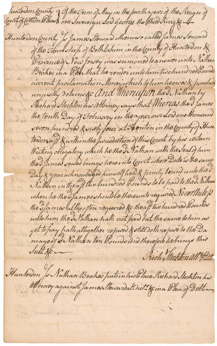 Lawyer, jurist, legislator, and a signer of the Declaration of Independence from New Jersey. DS, signed “Rich Stockton Atty,” one page both sides, 7.75 x 12.5, dated in the text February 10, 1764. Legal brief regarding the case between James Stoward and Nathan Beakes “to render unto him two hundred pounds…which to him knows from him unjustly obtained and whereupon…Nathan by Richard Stockton his attorney ….” In very good condition, with a few small separations along fragile intersecting folds, light toning, and show-through from writing on reverse. In his 1995 reference History Comes to Life, Kenneth Rendell places Stockton’s autograph material into the “very rare” category among the Signers—an echelon second only to that occupied by the virtually unobtainable Gwinnett and Lynch. Pre-certified John Reznikoff/PSA/DNA and RRAuction COA.