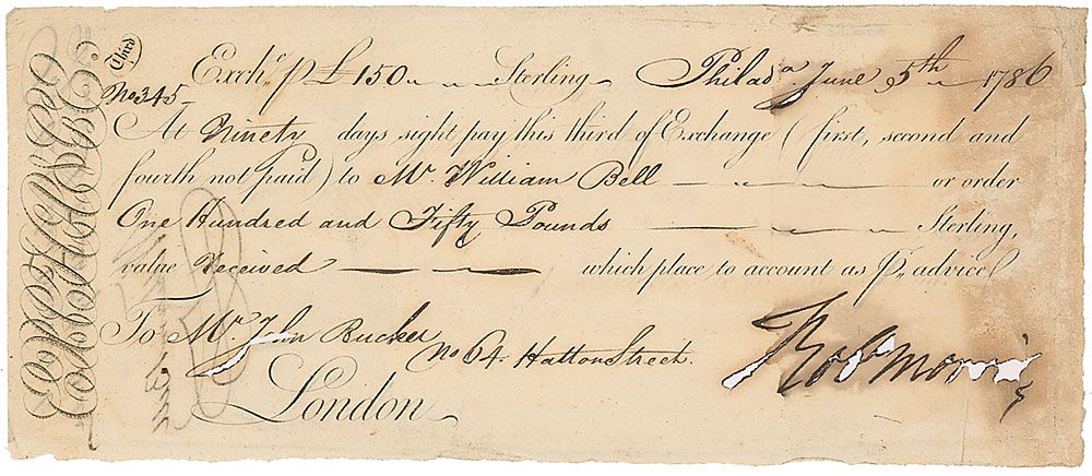 Partly-printed DS, signed “Robt. Morris,” one page, 9.5 x 4, Philadelphia, June 5, 1786. Bill of exchange drawn on John Rucker. In part: “At ninety days sight pay this third of Exchange (first, second and fourth not paid) to Mr. William Bell or order One Hundred and Fifty Pounds Sterling value received.” In very good condition, with scattered toning and moderate to heavy ink erosion to signature and other bits of text.