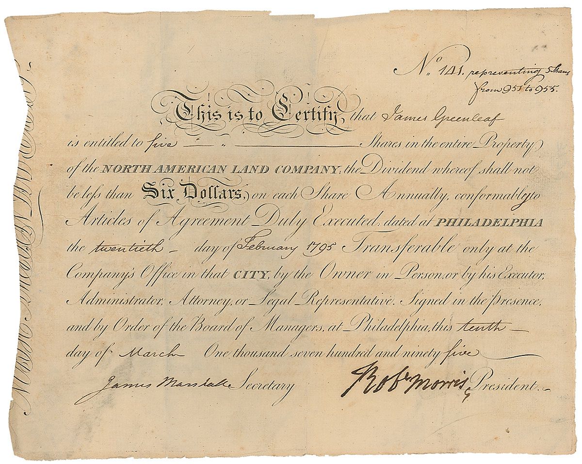 Partly-printed DS, signed “Rob’t Morris,” one page, 12 x 9.5, March 10, 1795. Morris certifies that James Greenleaf “is entitled to five Shares in the entire Property of the North American Land Company; the Dividend whereof shall not be less than Six Dollars on each Share Annually.” Boldly signed at the conclusion by Morris and countersigned by James Marshall. Intersecting folds (some with edge separations), otherwise fine condition.