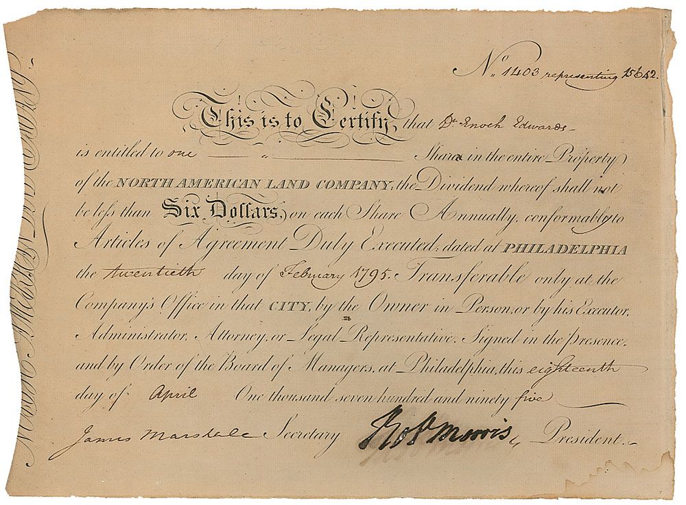 Partly-printed DS, signed “Rob’t Morris,” one page, 9.25 x 12.5, April 18, 1795. Certificate issued to Dr. Enoch Edwards for “one share in the entire property of the North American Land Company; the Dividend whereof shall not be less than Six Dollars on each Share Annually.” Boldly signed at the conclusion by Morris as the company’s president, and countersigned by James Marshall as secretary. Unobtrusive dampstaining to lower right corner, and some slight ink erosion to signature, otherwise fine condition.