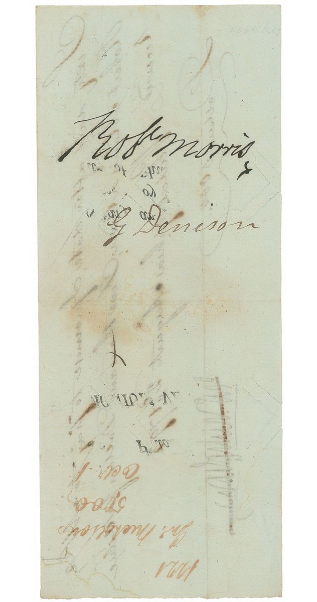 Signer of the Declaration of Independence, the Articles of Confederation, and the Constitution (1734–1806). Bold endorsement signature, “Robt. Morris,” on the reverse of a 7.25 x 3 check made out to him for $5,000, signed by John Nicholson and dated August 2, 1793. Expected cancellation cuts (barely touching a couple letters of the signature), a few subtle stains, and slight show-through from writing to reverse, otherwise fine condition.