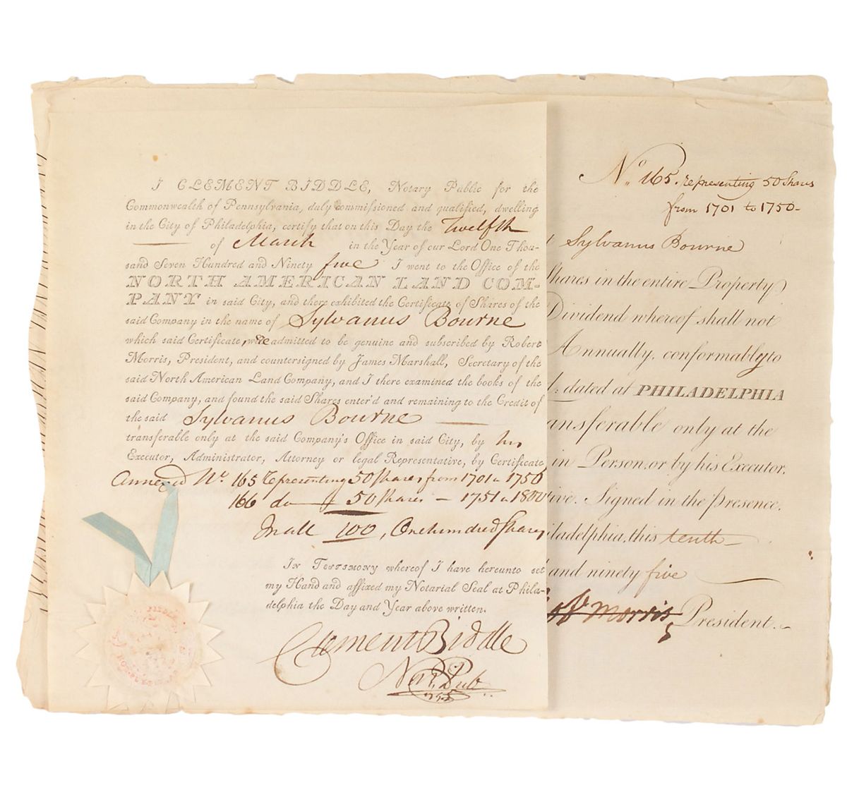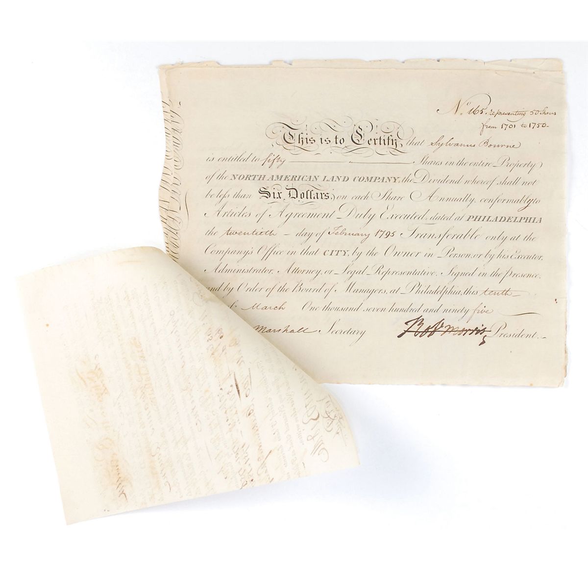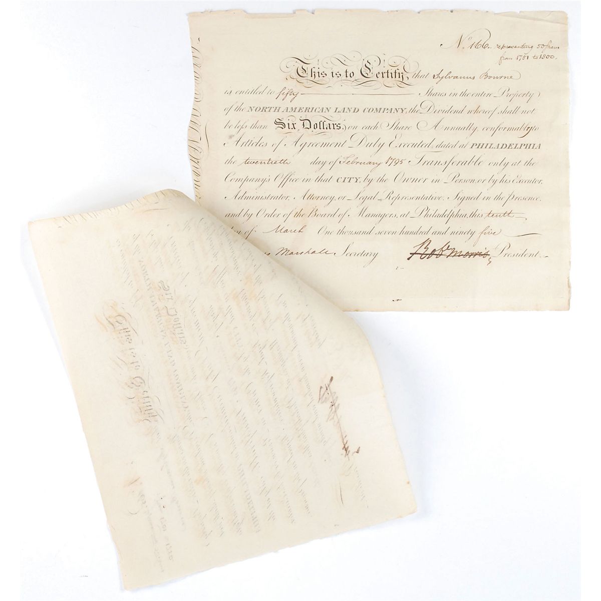 Signer of the Declaration of Independence, the Articles of Confederation, and the Constitution (1734–1806). Two partly-printed documents, both signed, “Robt. Morris,” both 12.5 x 10, and dated March 10, 1975. Two stock certificates issued to Sylvanus Bourne, stating he owns a total of 100 shares of the North American Land Company (50 shares per certificate). Both are signed at the conclusion by Morris as the company’s president, and by the company’s secretary James Marshall. Both certificates are bound with a blue ribbon, and a 7.75 x 9.5 document, dated March 12, 1795, and signed “Clement Biddle, Not Pub,” attesting to the two stock certificates. In fine condition, with a horizontal ink cancellation line to each of Morris’s signatures, and some scattered light toning. The paper seal is crisp and intact and only slightly worn.