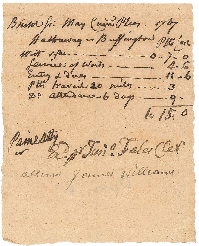 ADS, signed “Paine Atty,” one page, 3 x 3.75, 1767. Bill for his legal services in the amount of £1.15.0, including charges for “writ & fee,” “service of writ,” “entry & dues,” and “attendance 6 days.” In fine condition, with a central vertical fold.