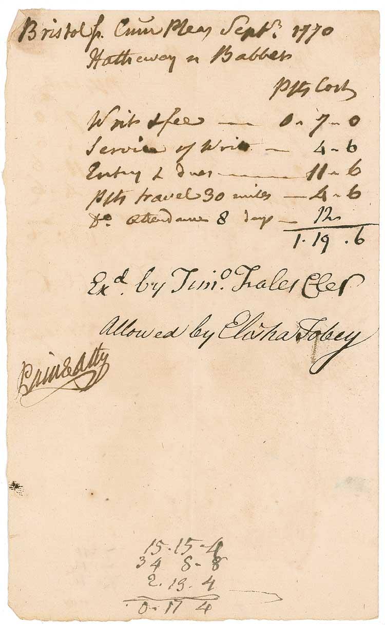 Massachusetts lawyer (1731–1814) who served as one of the prosecutors of British soldiers during the Boston Massacre trial; he later signed the Declaration of Independence. Manuscript DS, signed “Paine, Atty,” one page, 3.75 x 6.25, September 1770. Handwritten list of legal expenses, written in another hand. Expenses include a writ fee of seven shillings, 30 miles of travel of six shillings, and eight days of attendance, for a total monthly expense of £1.19.6. Some scattered toning, a bisecting vertical fold, and some light edge creases, otherwise fine condition. Pre-certified John Reznikoff/PSA/DNA and RRAuction COA.