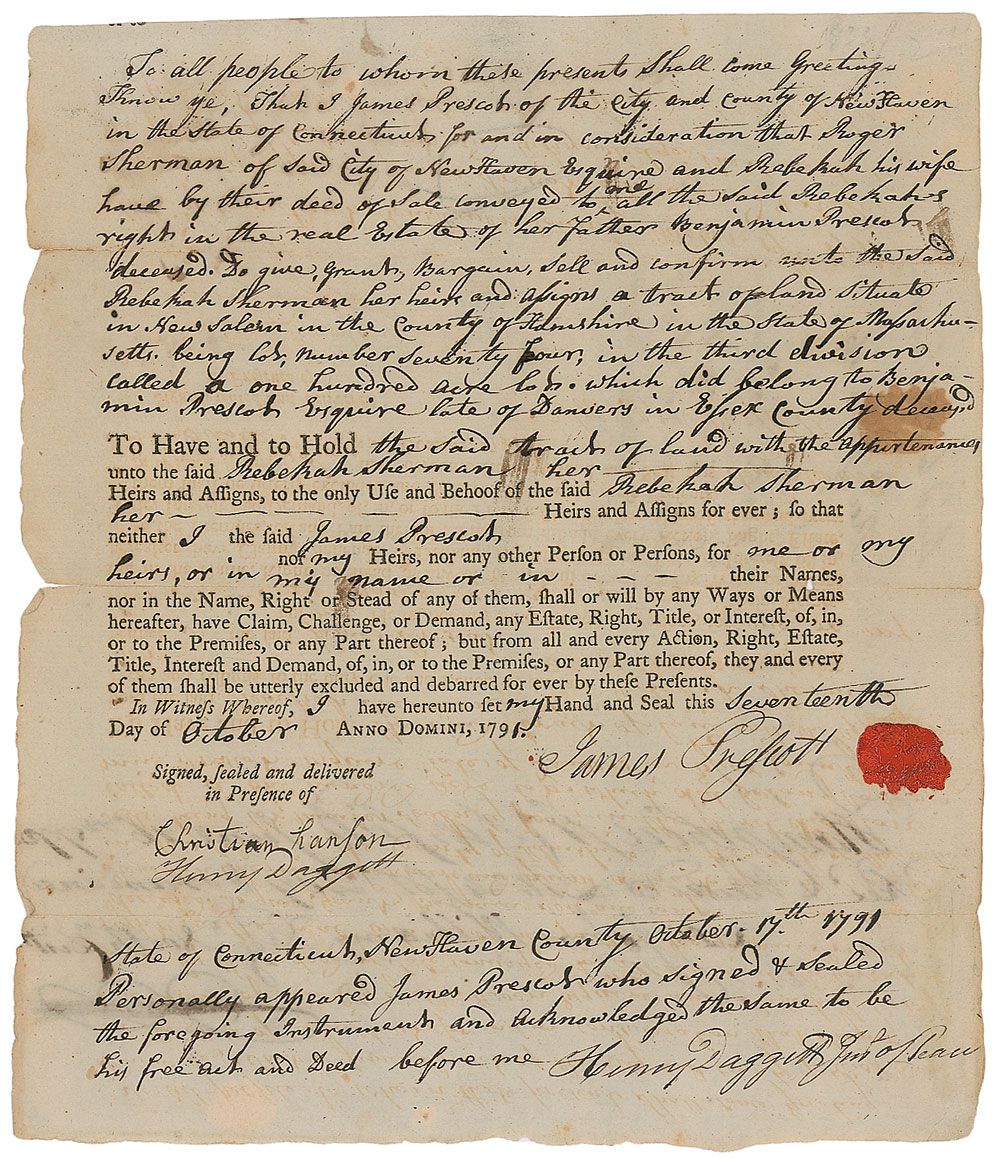 Signer of the Declaration of Independence from Connecticut (1721–1793) who was also the only man to also sign the Articles of Association, the Articles of Confederation, and the US Constitution. Partly-printed ADS, signed in the text only“Roger Sherman,” one page, 7.5 x 8.5, October 17, 1791. Land sale document reads, in part: “To all people to whom these presents shall come Greetings. Know ye, That I James Prescot of the City and County of New Haven in the State of Connecticut for and in consideration that Roger Sherman of said City of New Haven Esquire and Rebekah his wife have by their deed of Sale conveyed to me all the Said Rebekah’s right in the real Estate of her father Benjamin Prescot deceased. Do give, grant, Bargain, Sell and confirm unto the Said Rebekah Sherman her heirs and assigns a tract of land Situate in New Salem in the County of Hamshire in the State of Massachusetts, being lot, number Seventy four, in the third division called a one hundred acre lot, which did belong to Benjamin Prescot Esquire late of Danvers in Essex County deceased.” Signed at the conclusion by James Prescott, and witnessed by Christian Lanson and Henry Daggett. At the bottom Sherman also writes: “State of Connecticut, New Haven County October 17th 1791 Personally appeared James Prescot who Signed & Sealed the foregoing Instrument and Acknowledged the Same to be his free act and Deed before me.” Signed at the conclusion by Henry Daggett. In very good condition, with a couple partial separations along horizontal folds, a few small brushes to text, show-through from docketing on reverse, mild toning, with a heavier circle from red wax seal, and a few edge chips. All of Sherman’s writing remains crisp and bold.
