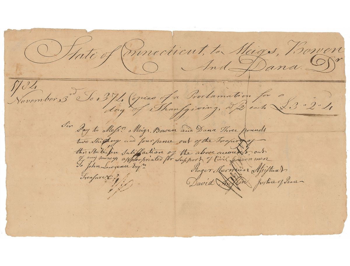 Signer of the Declaration of Independence from Connecticut (1721–1793) who was the only man to also sign the Articles of Association, the Articles of Confederation, and the US Constitution. Manuscript DS, one page, 12.25 x 7.25, November 3, 1784. A pay order for £3.2.4 issued to Messrs. Meigs, Bowen, and Dana for the printing of “374 Copies of a Proclamation for a day of Thanksgiving.” In very good condition, with intersecting folds (partial separations with some archival reinforcements to reverse), mild soiling and staining, and countersignature written across a few letters of Sherman’s last name. A wonderful piece of history related to what is arguably the oldest American tradition—Thanksgiving.