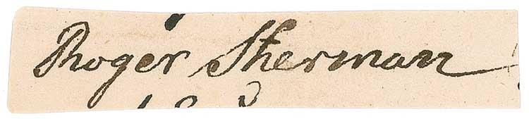 Signer of the Declaration of Independence from Connecticut (1721–1793) who was also the only man to also sign the Articles of Association, the Articles of Confederation, and the U.S. Constitution. Crisp and bold ink signature, “Roger Sherman,” on an off-white 2.5 x .5 slip. In fine condition, with a few stray ink marks. Pre-certified John Reznikoff/PSA/DNA and RRAuction COA.