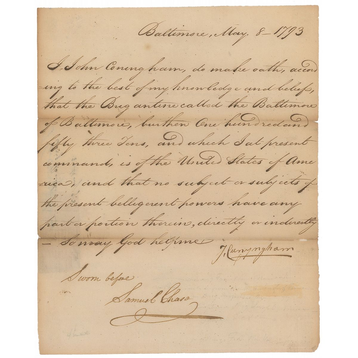This document seems to relate to the Citizen Genet Affair, in which French ambassador Charles Genet began to issue privateering commissions to Americans, allowing them to seize British ships and cargo for personal profit under the approval and protection of the French government—this violated President Washington’s recent Proclamation of Neutrality, which declared that the nation would remain neutral in the ongoing conflict between France and Great Britain. In the present document, signed by Chase as Chief Justice of the Maryland General Court, Cunningham swears that his ship is uncompromised by foreign interests. Chase is one of the most difficult Declaration signers’ autographs to obtain, with this an being an especially desirable example due to its historical context.