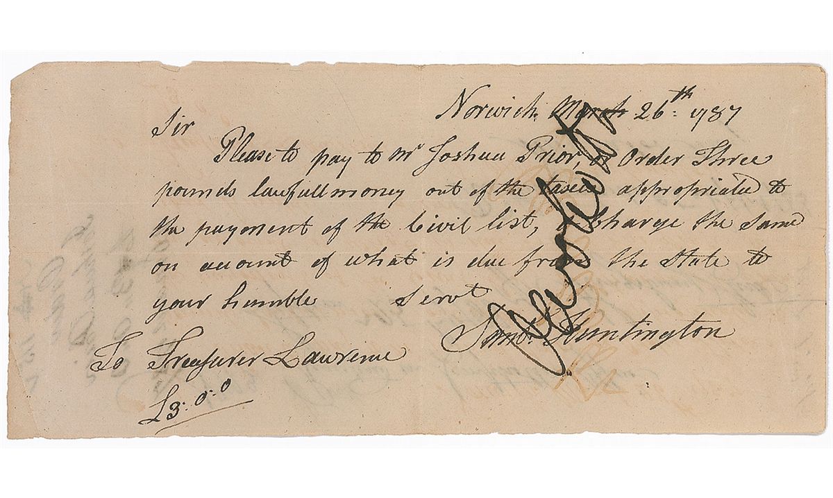 Signer of the Declaration of Independence from Connecticut (1731–1796) and seventh President of the Continental Congress. ADS, signed “Sam’l Huntington,” one page, 7.25 x 3.25, March 26, 1787. Huntington orders the treasurer of Connecticut to “pay to Mr. Joshua Prior, or Order Three pounds lawfull money out of the taxes appropriated to the payment of the civil list.” Central vertical and horizontal folds and a bold cancellation endorsement affecting the beginning portion of the signature, otherwise fine condition.