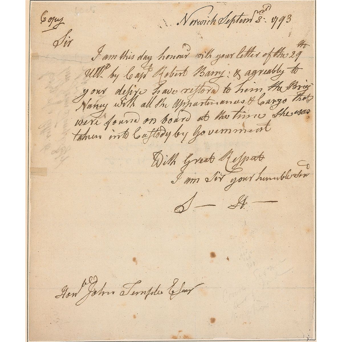 ALS signed “S— H—,” one page, 7.25 x 8.5, September 3, 1793. Letter to John Temple, the British consul-general to the United States, concerning the return of an English ship seized by an illegal French privateer. In full: “I am this day honore’d with your letter of the 29th Ulto. by Capt Robert Barry; & agreeably to your desire have restored to him the Brig. Nancy with all the Appurtenances & Cargo that were found on board at the time she was taken into Custody by Government.” Professionally inlaid into a slightly larger sheet. In fine condition, with partial separations to intersecting folds repaired with tape to reverse.