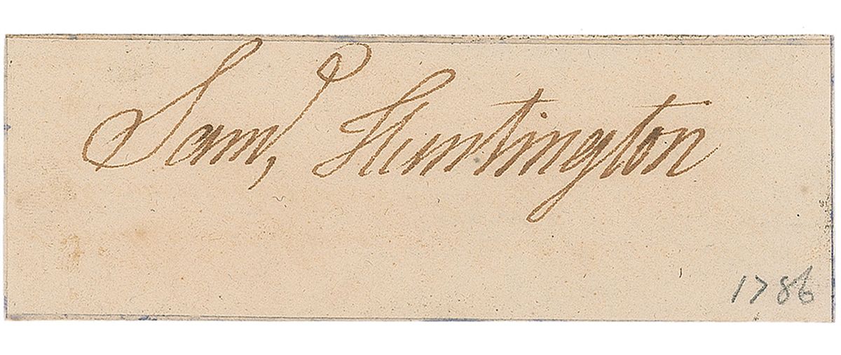 Signer of the Declaration of Independence from Connecticut (1731–1796) and seventh President of the Continental Congress. Choice ink signature, “Sam’l Huntington,” on an off-white 4 x 1.5 slip. In fine condition.