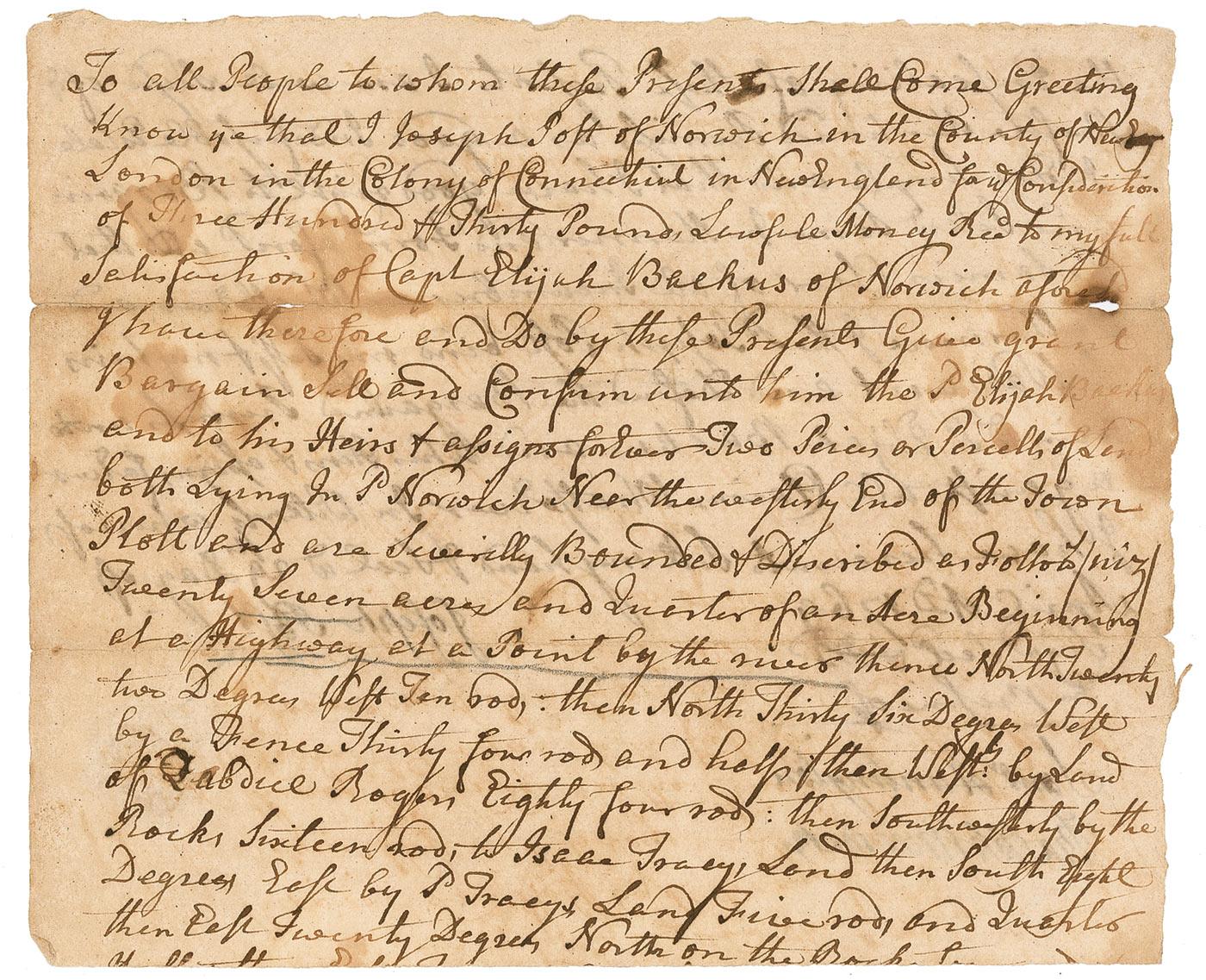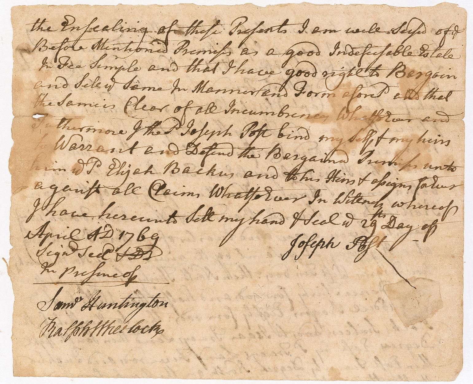 Signer of the Declaration of Independence from Connecticut (1731–1796) and seventh President of the Continental Congress. Partial manuscript DS, signed “Saml. Huntington,” one page both sides, 7.5 x 6, April 29, 1769. Partial document regarding the sale of 27 acres of land, signed by Joseph Ross, and signed in the lower left by Huntington as a witness. In very good condition, with scattered toning, intersecting folds, a few small areas of ink erosion, and a rough top edge. Pre-certified John Reznikoff/PSA/DNA and RRAuction COA.