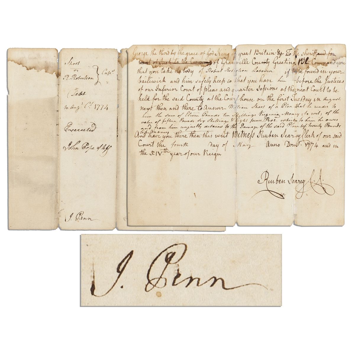 Document signed by John Penn, founding father and signer of the Declaration of Independence. Dated 4 May 1774 from North Carolina, sheriff's department document is signed, ''J. Penn'' to verso. Measures 7.5'' x 6.25''. Separation starting along folds, dampstaining to top edge, pencil note with arrow pointing to signature and scattered tape repairs. Overall very good given age.