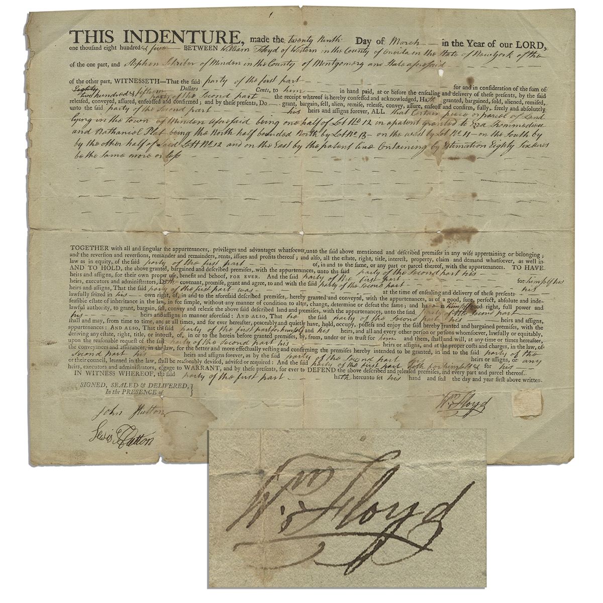 Declaration of Independence signer and Continental Congressman William Floyd document signed, dated 29 March 1805. Partially printed Indenture document delineates various settlements of land and holdings in New York. Signed ''Wm Floyd'' and countersigned by witnesses John and Lewis Sutton, document measures 15.5'' x 12.75'' on one page. Separations forming along folds and dampstaining slightly affecting signature, else very good.
