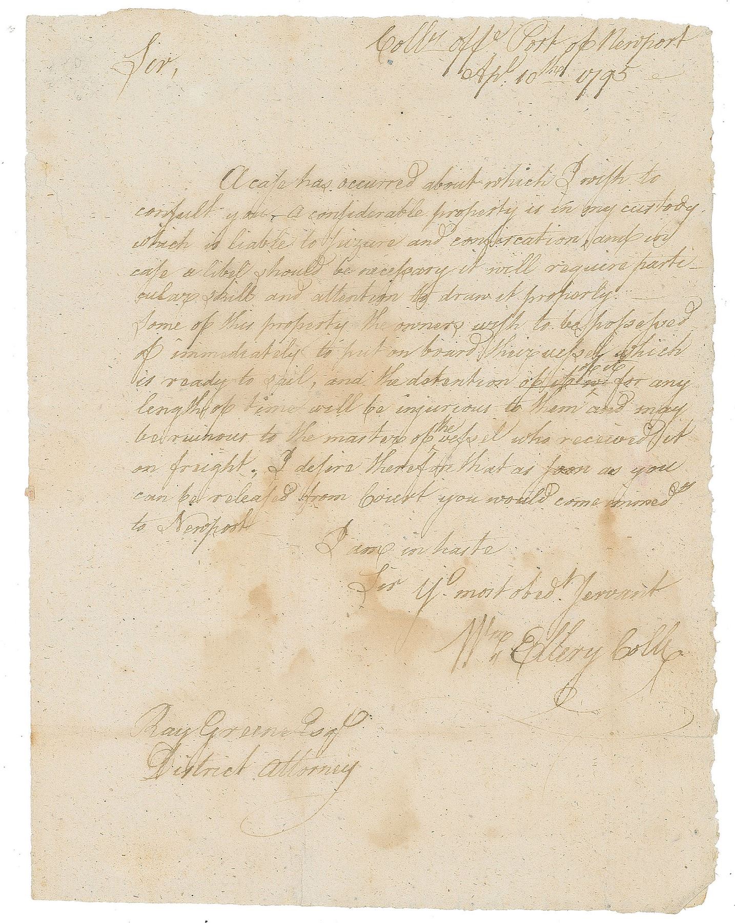 ALS signed “Wm. Ellery, Coll.,” one page, 6.5 x 8.5, April 10, 1795. Letter to District Attorney Ray Greene, written as collector of the port of Newport, Rhode Island. In part: “A case has occurred about which I wish to consult you. A considerable property is in my custody which is liable to seizure and confiscation, and in case a libel should be necessary it will require a particular skill and attention to draw it properly. Some of this property the owners wish to be possessed of immediately to put on board their vessel, which is ready to sail…I desire therefore that as soon as you can be released from Court you would come immed’y to Newport.” In fine condition, with light scattered dampstaining affecting appearance but not readability. Accompanied by a full letter of authenticity from JSA.