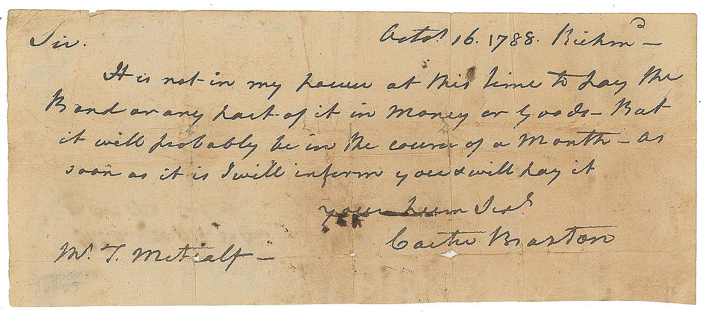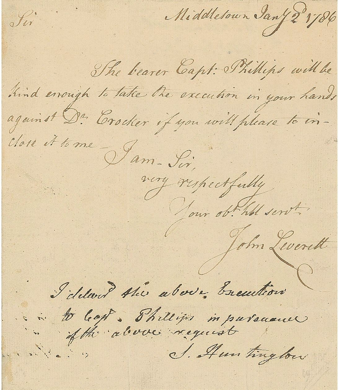 Autograph endorsement, "I deliver'd the above Executions to Capt. Phillips in pursuance of the above request, S. Huntington," at the conclusion of a letter sent to him by John Leverett, one page, 6 x 7, January 2, 1786. Leverett's request, in full: "The bearer Capt: Phillips will be kind enough to take the execution in your hands against Dr. Crocker if you will please to inclose it to me." Affixed to a larger sheet. In fine condition, with trimmed edges.