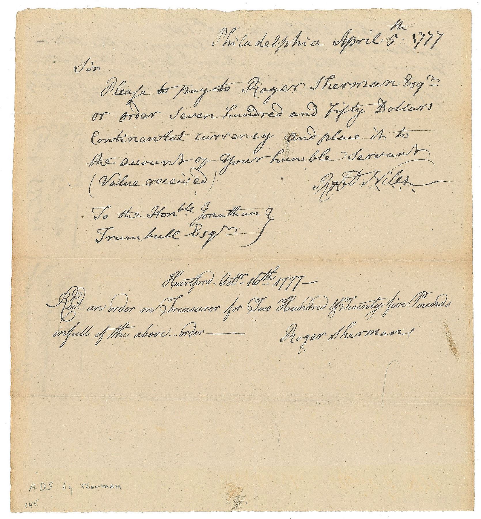 Revolutionary War–dated manuscript DS, endorsed, “Roger Sherman,” one page, 8.25 x 9, issued at Philadelphia, April 5, 1777. A pay order submitted to Jonathan Trumbull, in part: “Please to pay to Roger Sherman Esq’r or order Seven hundred and fifty Dollars Continental currency.” Below, on October 16, 1777, Sherman confirms receipt of “Two Hundred & Twenty five Pounds in full.” In fine condition.