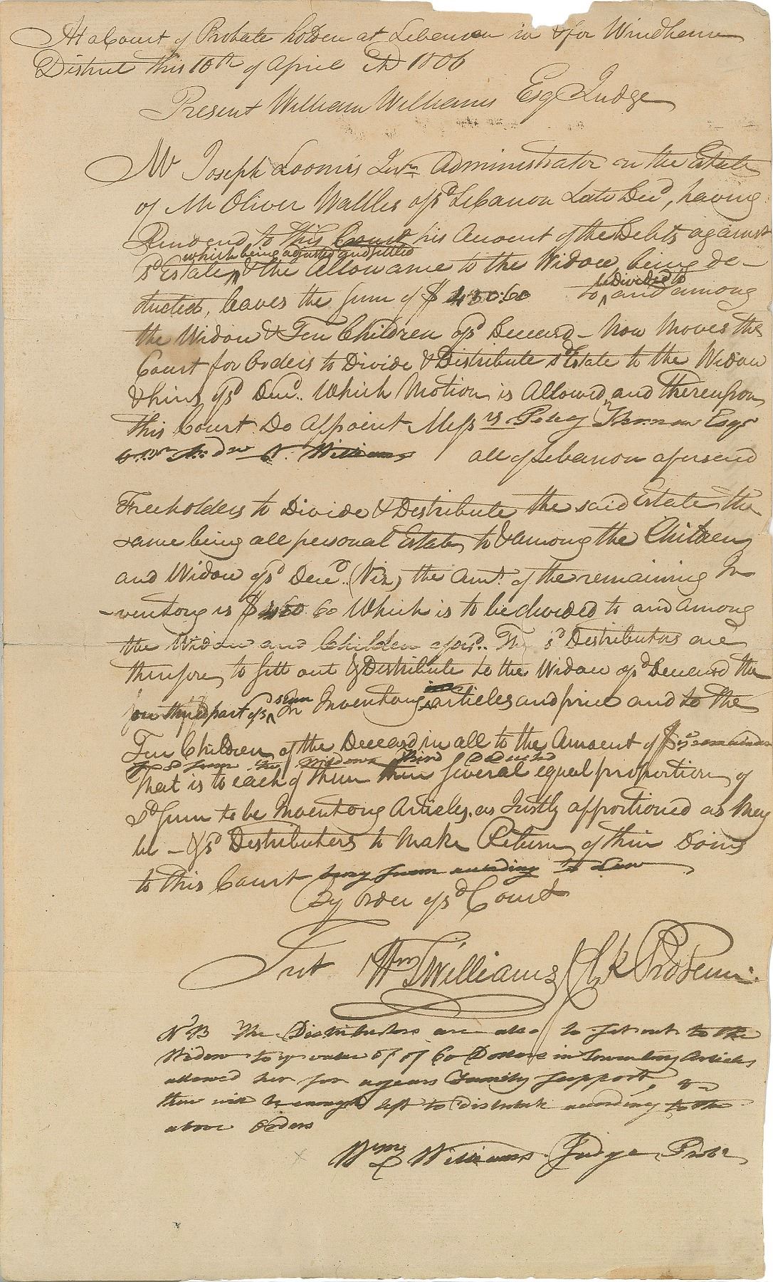 Interesting manuscript DS, signed “W. Williams” and “Wm. Williams, Judge Prob.,” one page, 7.25 x 12.75, April 10, 1806. Probate court document outlining distribution orders for the estate of Mr. Oliver Wattles of Lebanon. Williams makes several handwritten emendations to the body of the document, adding a five-line note at the conclusion. Signed both within the body and at the conclusion by Williams. In fine condition, with some chipping to edges and archival tape repairs to reverse. Accompanied by a full letter of authenticity from JSA.