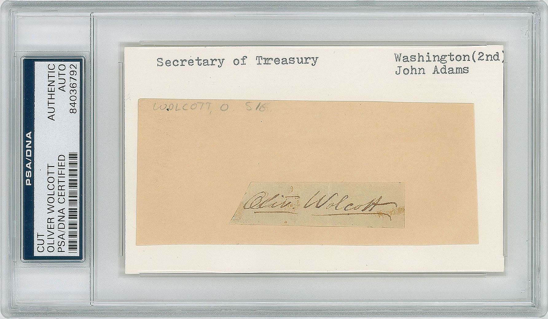 Ink signature, “Oliv. Wolcott,” on an off-white 2.25 x .5 slip. Affixed to a larger card and encapsulated in a plastic PSA/DNA authentication holder. In fine condition.