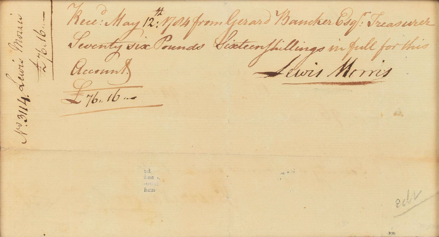 Manuscript DS, one page both sides, 7.75 x 4.25, May 12, 1784. A pay order for Morris's services in the New York State Senate, signed on the front by Pierre Van Cortlandt, in part: "The State of New York, To Lewis Morris…To my attendance in Senate as a Member from the 24th day of January to the 12th day of May, 94 days and 2 Travelling days, 96 days, at 16/ £76.16." Morris endorses below an acknowledgment of the payment on the reverse, in part: "Rec'd May 12th 1784 from Gerard Bancker Esqr Treasurer Seventy six Pounds Sixteen shillings in full for this account." In fine condition. Pierre Van Cortlandt served as the first lieutenant governor of New York and was president of the New York State Constitutional Convention in 1777; on July 9, 1776, he was among 38 delegates to ratify the Declaration of Independence at White Plains. Morris served as a New York state senator from 1783 to 1790.