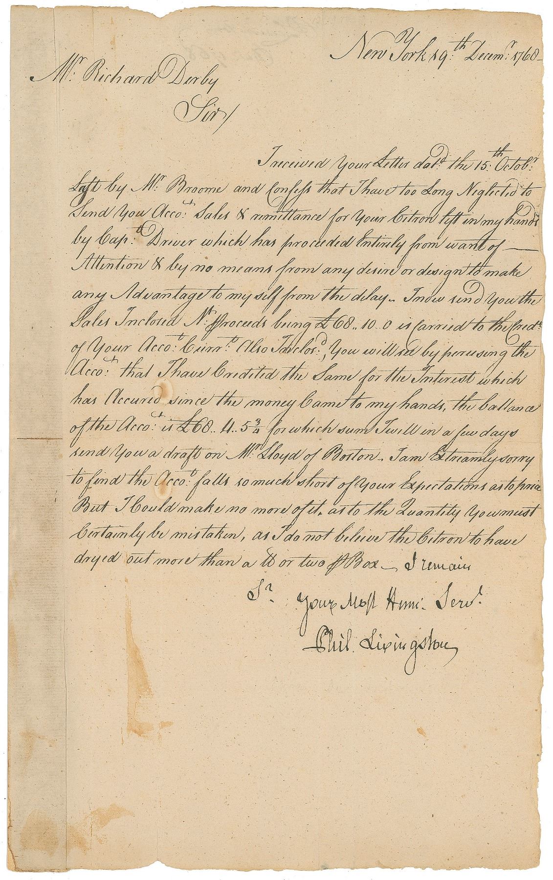 LS signed “Your most Hum: Serv’t., Phil. Livingston,” one page, 7.5 x 12.25, December 19, 1768. Letter to Richard Derby, in part: “I received your Letter dat’d the 15th Octob’r last by Mr. Broome and confess that I have too Long Neglected to Send you Acc’t Sales & admittance for your Citron left in my hands by Capt. Driver which has proceeded Entirely from want of Attention & by no means from any desire or design to make any Advantage to my self from the delay. I now send you the Sales Inclosed…proceeds being £68.10.0.” In fine condition, with show-through along the left edge from a mounting strip to the reverse, and a few small stains. Accompanied by a full letter of authenticity from JSA.