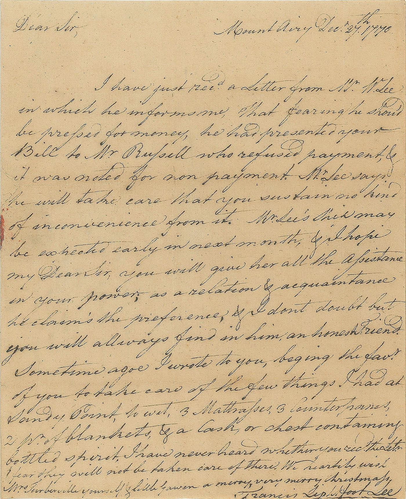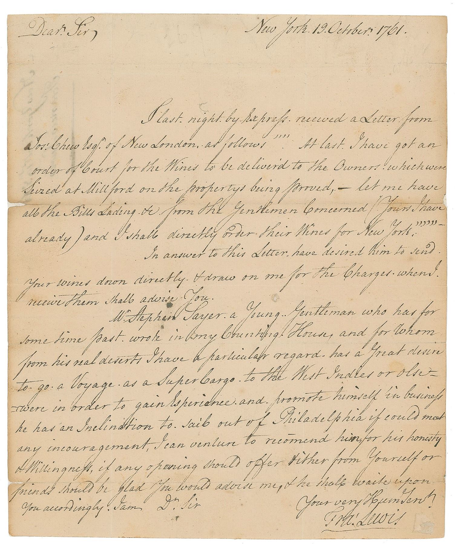 ALS signed “Fra. Lewis,” one page, 7.5 x 9, October 19, 1761. Letter to a gentleman, in part: “I last night by Express received a Letter from Jos. Chew Esqr. of New London, as follows, ‘At last, I have got an order of Court for the Wines to be deliver’d to the Owners, which were Seized at Millford on the propertys being proved,—let me have all the Bills Lading &c. From the Gentlemen Concerned (Yours I have already) and I shall directly order their Wines for New York.’ In answer to this Letter, have desired him to send your wines down directly & draw on me for the Charges…Mr. Stephen Sayer…has a great desire to go a Voyage as a Super Cargo to the West Indies or elsewhere in order to gain Experience and promote himself in business.” Professionally silked on the reverse and in fine condition. Accompanied by a full letter of authenticity from JSA.