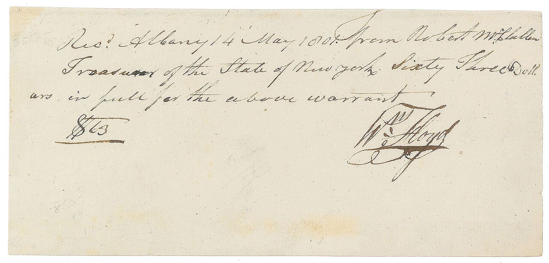 Manuscript DS signed “Wm. Floyd,” one page, 6.75 x 3, May 14, 1801. A payment receipt, in full: “Rec’d Albany, 14 May 1801 from Robert McClellan Treasurer of the State of New York, Sixty Three Dollars in full for the above warrant.” Prominently signed at the conclusion by Floyd. In fine condition. Accompanied by a full letter of authenticity from JSA.