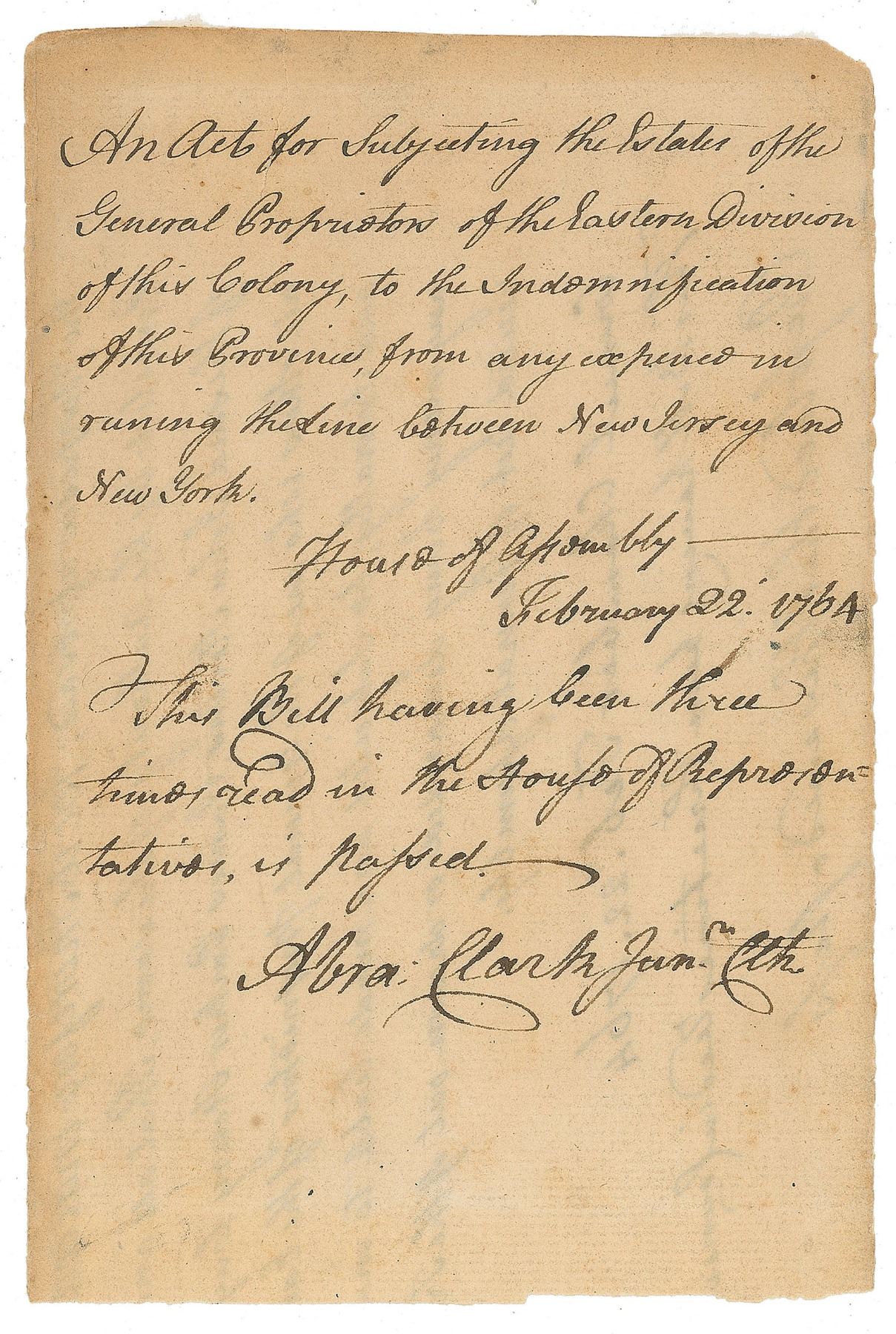 ADS signed “Abra: Clark Jun’r Clerk,” one page, 4 x 6, February 22, 1764. The docketing panel of a bill passed in the Provincial Assembly, identified as “An Act for Subjecting the Estate of the General Proprietors of the Eastern Division of this Colony, to the Indemnification of this Province, from any expences in running the Line between New Jersey and New York.” Clark writes: “House of Assembly, February 22, 1764, This Bill having been three times read in the House of Representatives, is passed.” The opposite side bears a section of the manuscript text of the act. In fine condition, with trimmed edges and a small tear to the top edge. Accompanied by a full letter of authenticity from JSA.