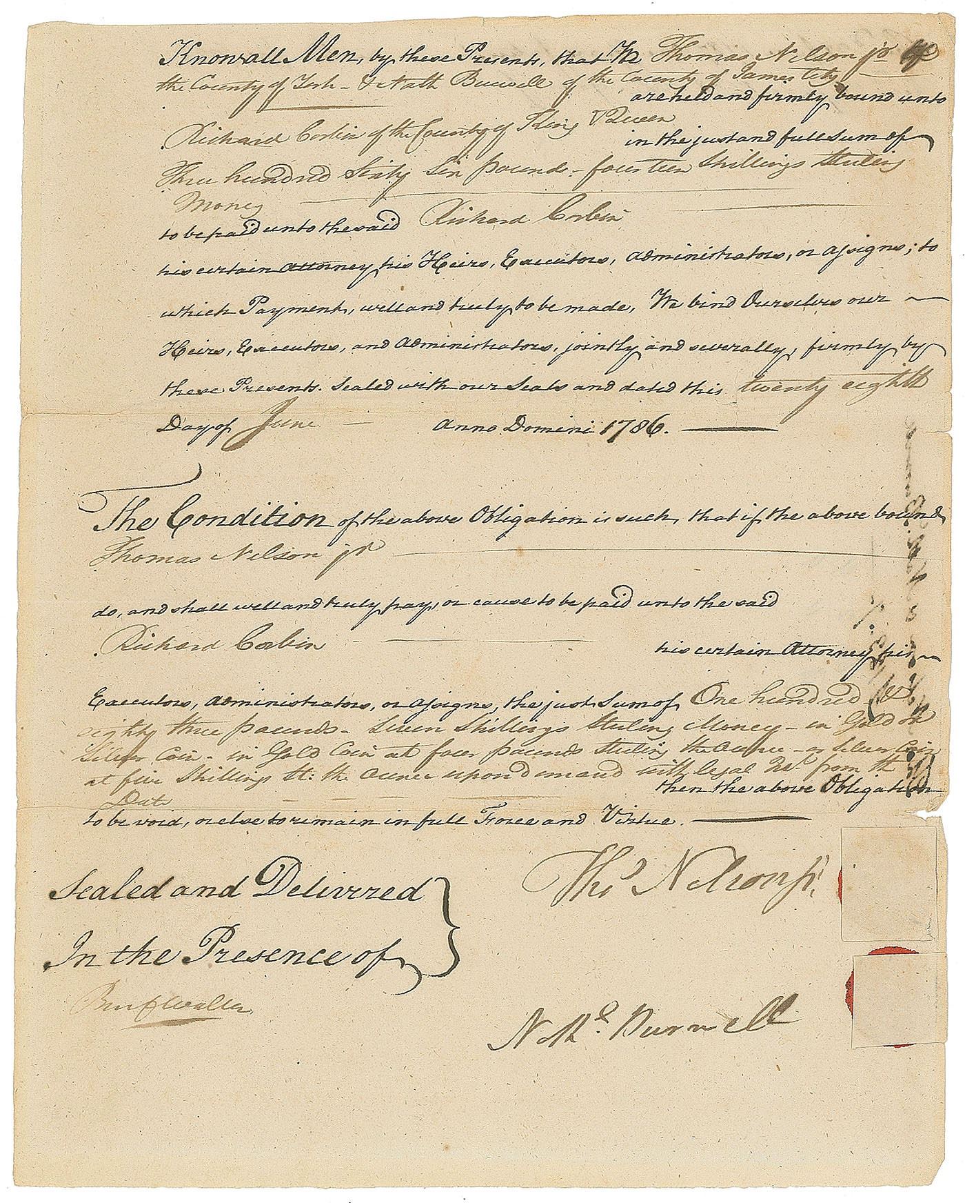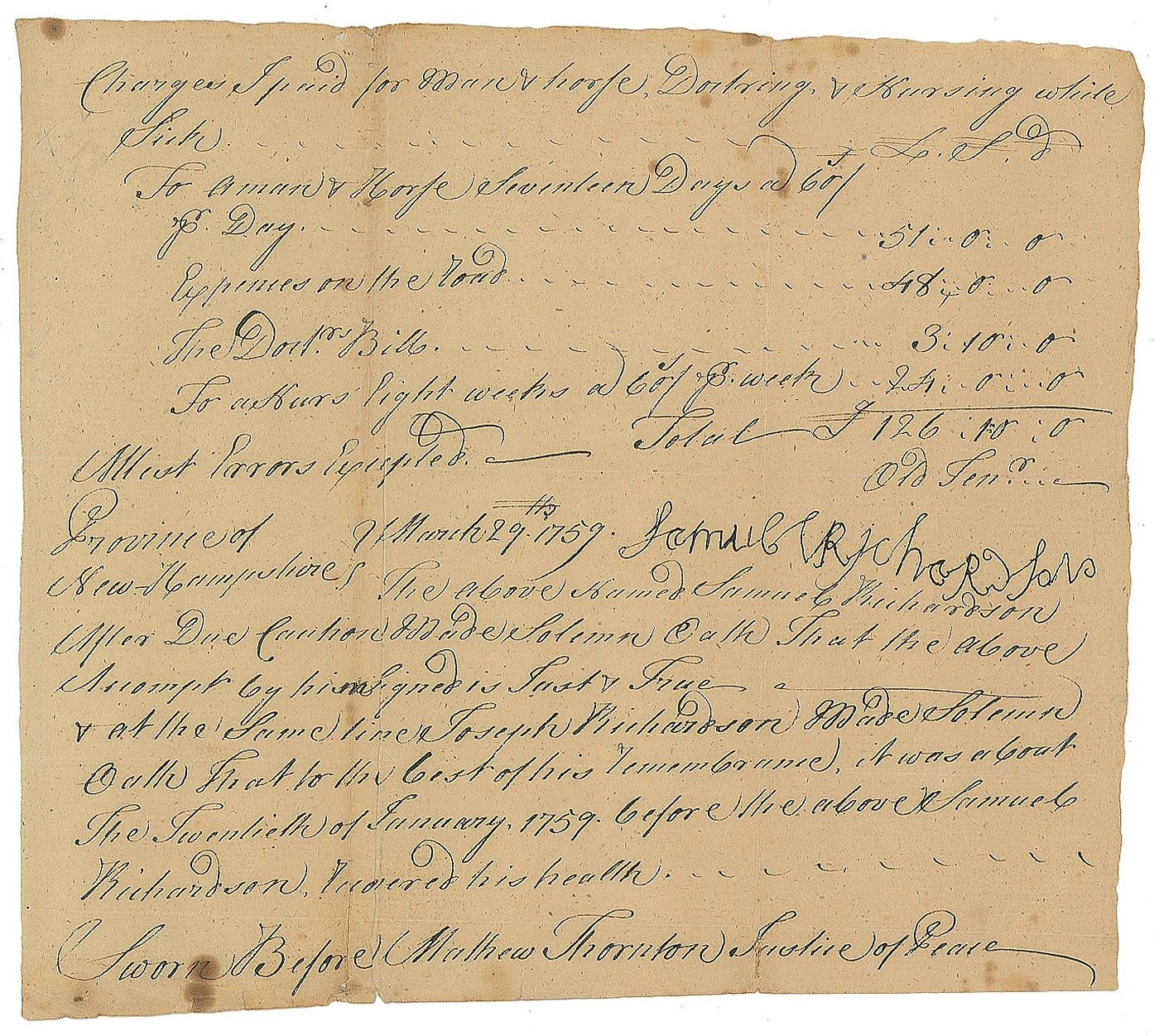 Sought-after ADS, signed "Mathew Thornton Justice of Peace," one page, 7.5 x 6.5, March 29, 1759. Affidavit concerning the cost of caring for a sick man. In part: "Charges I paid for Man & horse, Doctoring, & Nursing while Sick…The above named Samuel Richardson After Due Caution Made Solemn Oath That the above Account by him signed is Just & True." Removably encapsulated in a mylar sleeve. In fine condition, with edges possibly trimmed.