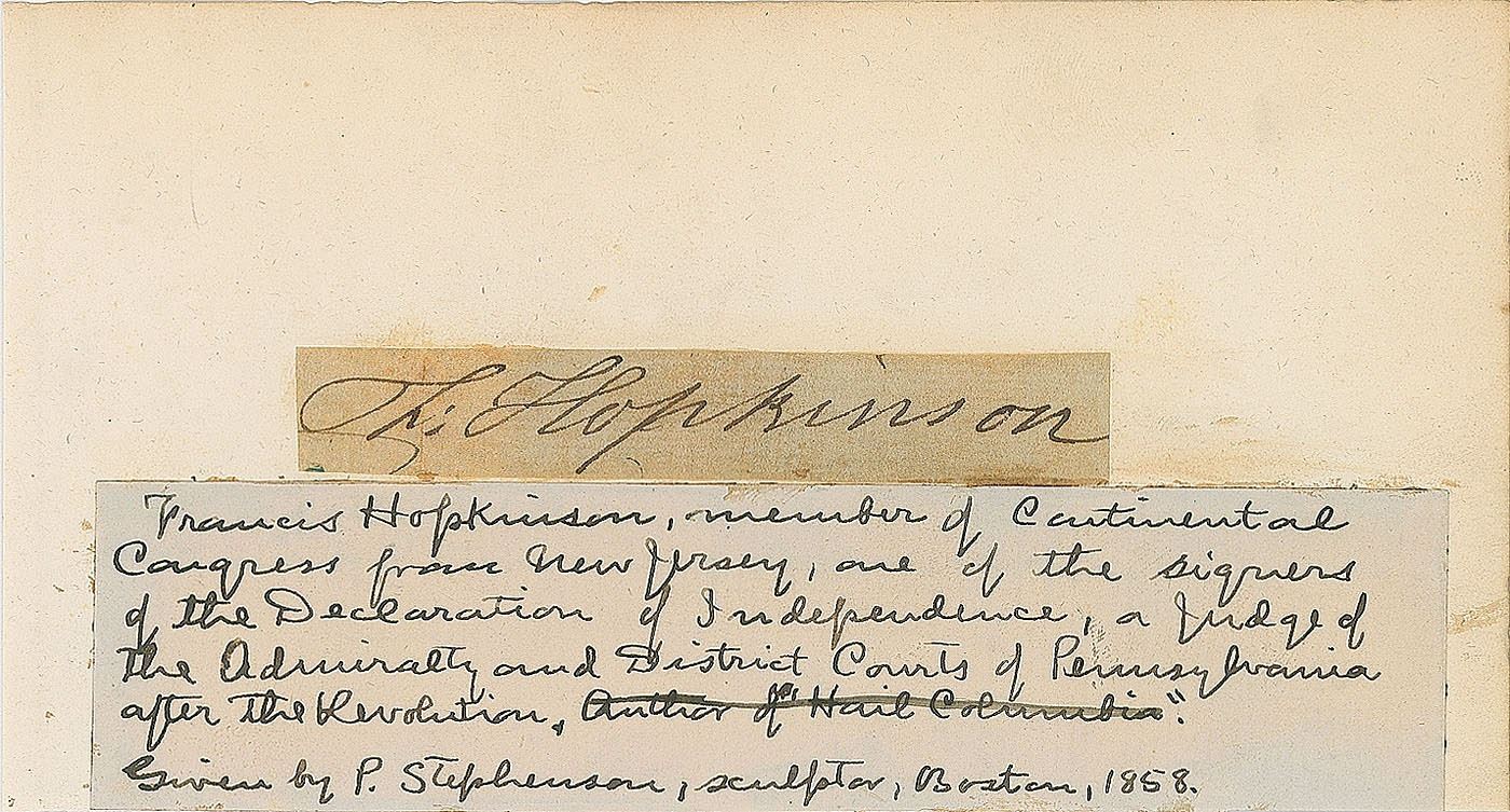Ink signature, "F: Hopkinson,” on an off-white 3 x .5 slip affixed to a larger card bearing a note indicating that the signature was obtained by Boston sculptor P. Stephenson in 1858. In very good to fine condition.