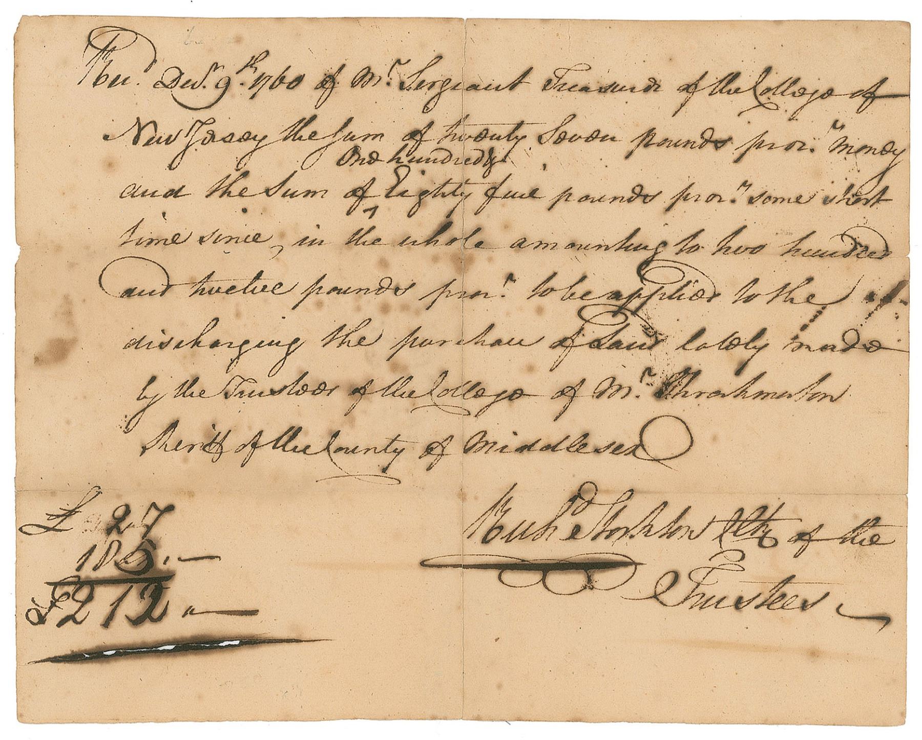 ADS signed “Rich’d Stockton Att’y of the Trustees,” one page, 7.75 x 6, December 9, 1760. In part: “Rec’d Dec’r 9th 1760 of Mr. Sergeant Treasurer of the College of New Jersey the Sum of twenty seven pounds…in the whole amounting to two hundred and twelve pounds…to be applied to…the purchase of Land lately made by the Trustees of the College.” In very good to fine condition, with a central vertical split repaired with tape on the reverse, and ink erosion affecting the sum penned in the lower left. Accompanied by a full letter of authenticity from JSA.