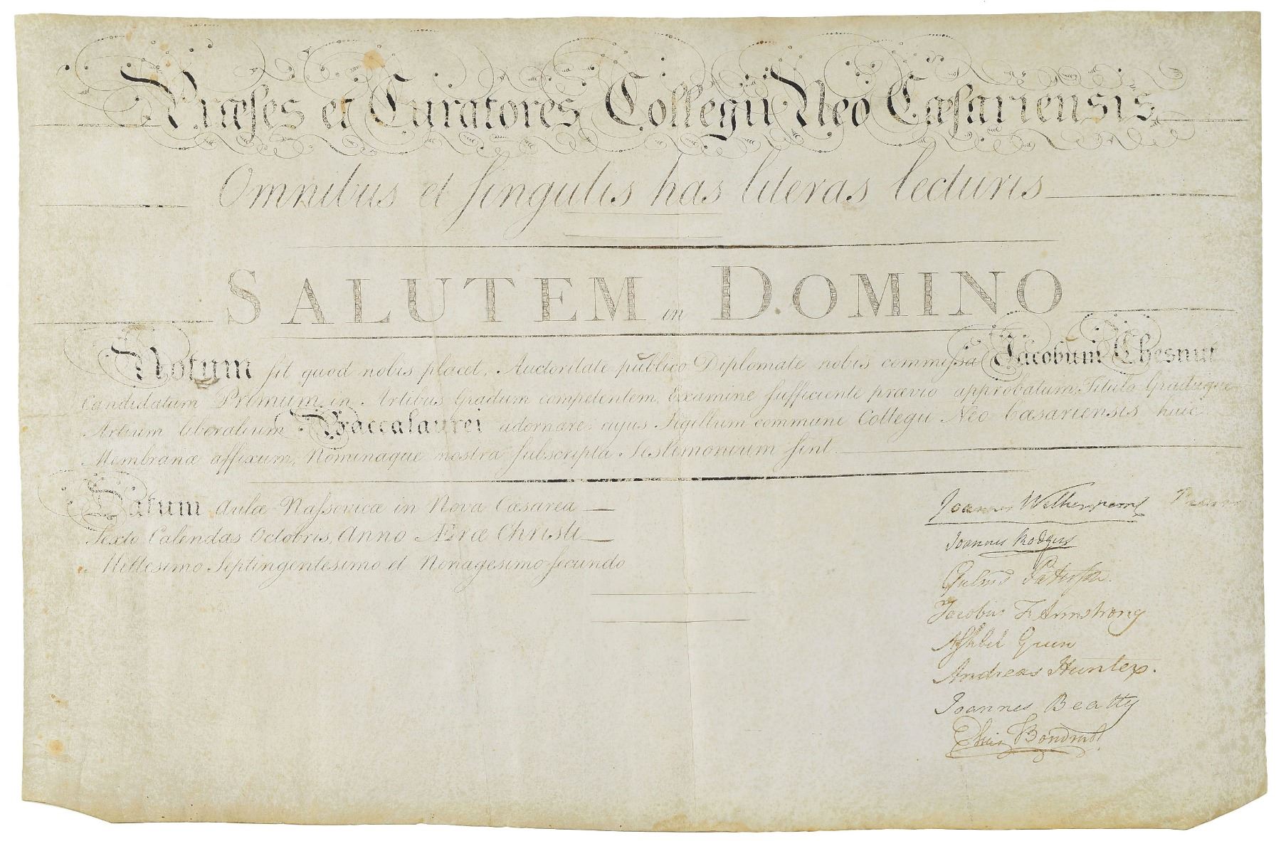 Ornate vellum manuscript DS in Latin, signed “Joannes Witherspoon Pres.,” one page, 19 x 13, October 1792. A diploma from the College of New Jersey (now Princeton University), signed at the conclusion by Witherspoon as the university’s president, and countersigned by seven trustees. Among the other signers are Continental Congressmen Elias Boudinot and John Beatty, and noted clergyman Ashbel Green. In very good to fine condition, with scattered soiling and a bit of flaking and fading to ink. Accompanied by a full letter of authenticity from JSA.
