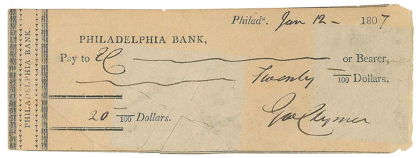 Philadelphia Bank check, 5.5 x 2, filled out and signed by Clymer, “Geo. Clymer,” made payable for $20, January 12, 1807. In fine condition, with light irregular toning to the front, and two pieces of reinforcing tape on the reverse.