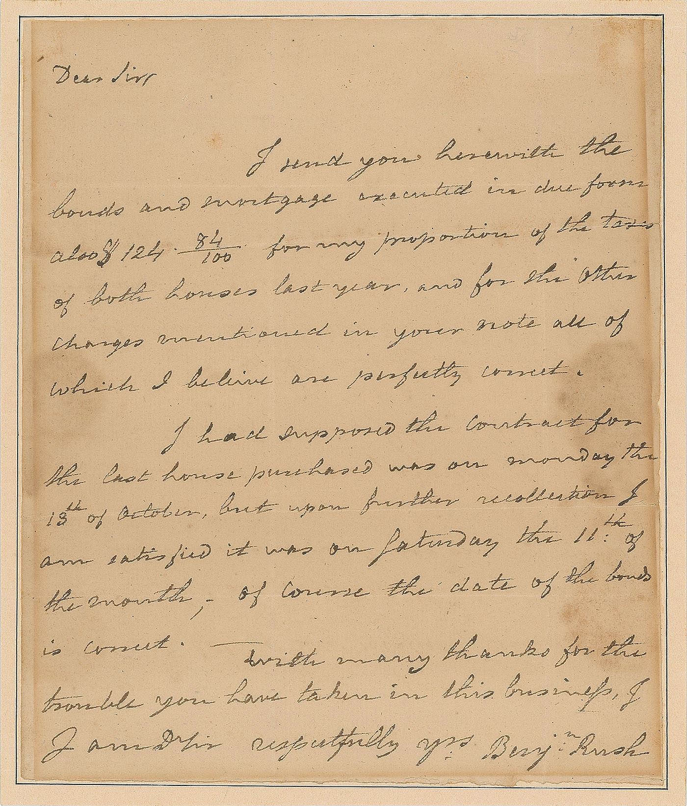 ALS signed “Benj’n Rush,” one page, 6.5 x 7.75, no date. Letter to a gentleman concerning his real estate dealings, in part: “I send you herewith the bonds and mortgage executed in due form also $124 84/100 for my proportion of the taxes of both houses last year, and for the other charges mentioned in your note all of which I believe are perfectly correct. I had supposed the contract for the last house purchased was on Monday the 13th of October, but upon further recollection I am satisfied it was on Saturday the 11th.” Professionally inlaid into a slightly larger sheet. In very good to fine condition, with dampstaining to edges affecting appearance but not readability. Accompanied by an engraved portrait.