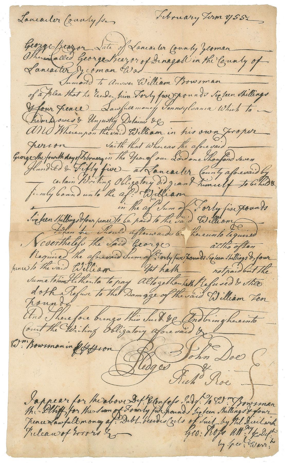 Manuscript DS with an autograph endorsement signed “Geo: Ross,” one page, 7.5 x 12.5, February 1755. A legal document concerning a financial dispute between George Reazor and William Bowsman, endorsed at the conclusion by Ross: “I appear for the above Def’t & Confess Judg’t tp Wm. Bowsman the Pltiff for the sum of Fourty five pounds sixteen shillings & four pence Lawfull money…Geo: Ross Att’ny Def’t by Spec’l Warr’t.” In very good to fine condition, with splits to folds and minor paper loss professionally repaired on the reverse.