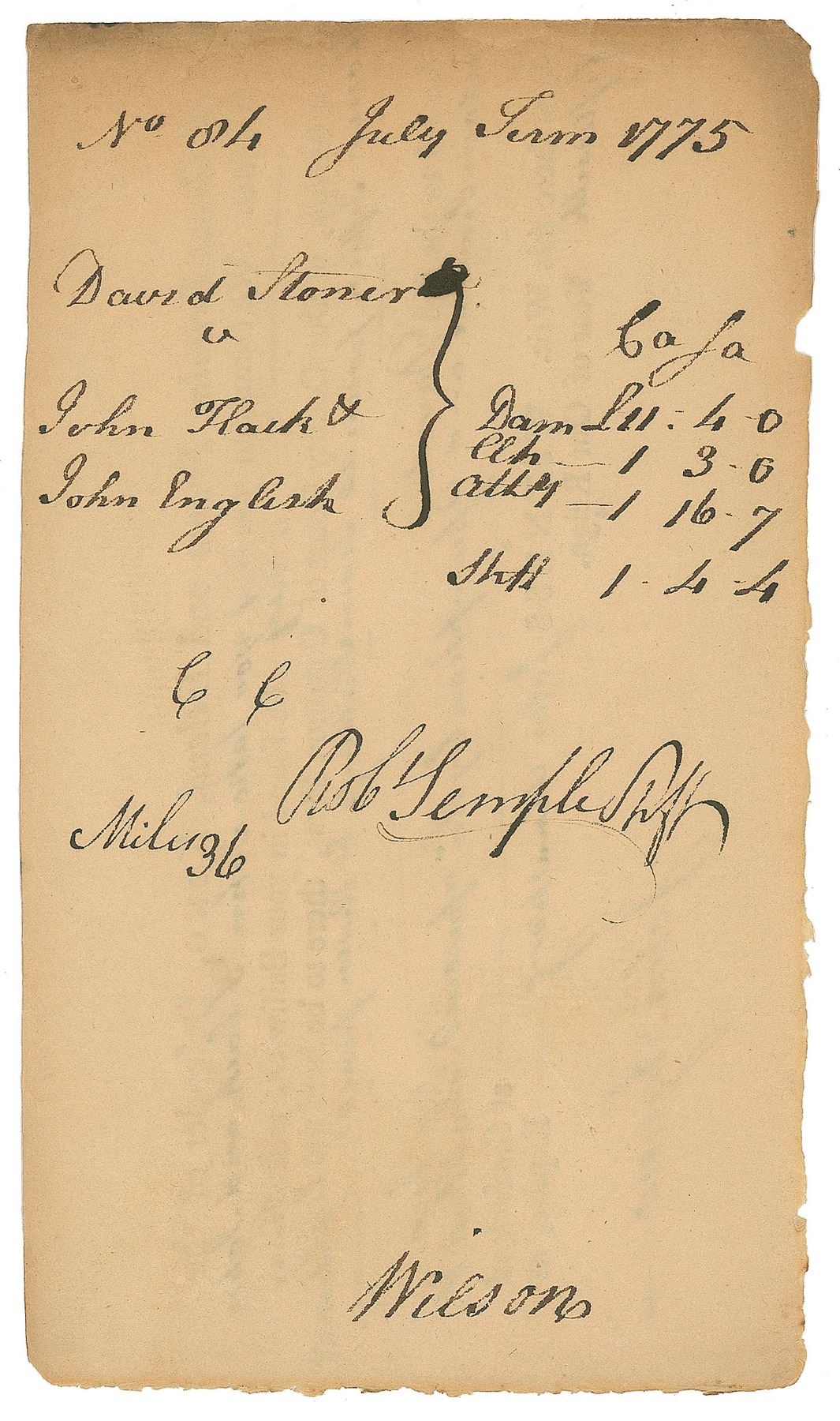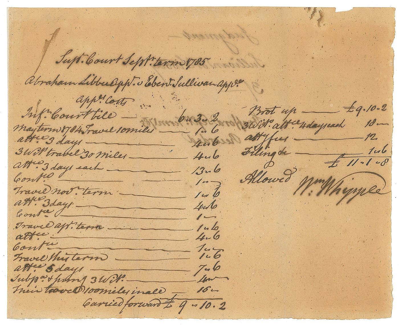 Scarce ADS, signed “Wm: Whipple,” one page, 7.5 x 6, September 1785. Document recording court costs in the case of Abraham Libbey v. Ebenezer Sullivan, itemized with travel costs, attorney fees, and filing charges, amounting to a total of £11.1.8. In fine condition, with uniform toning. Accompanied by a full letter of authenticity from JSA.
