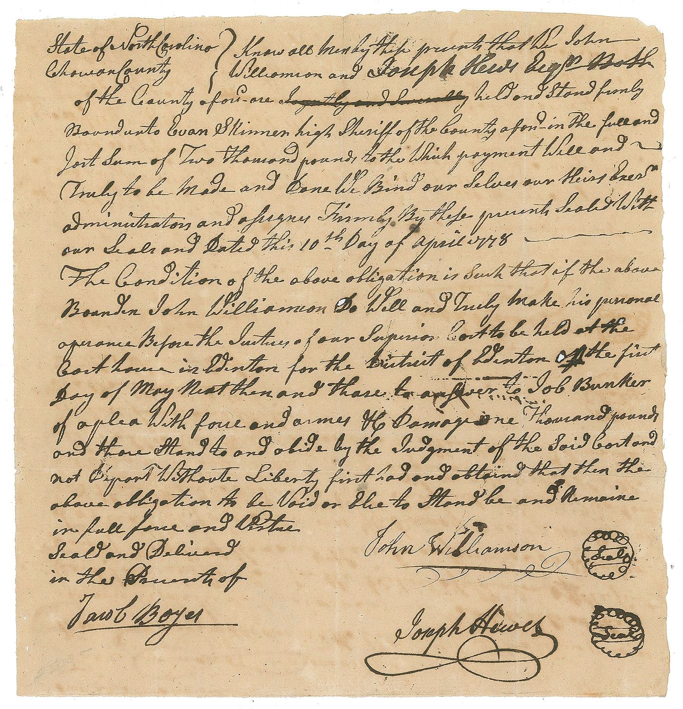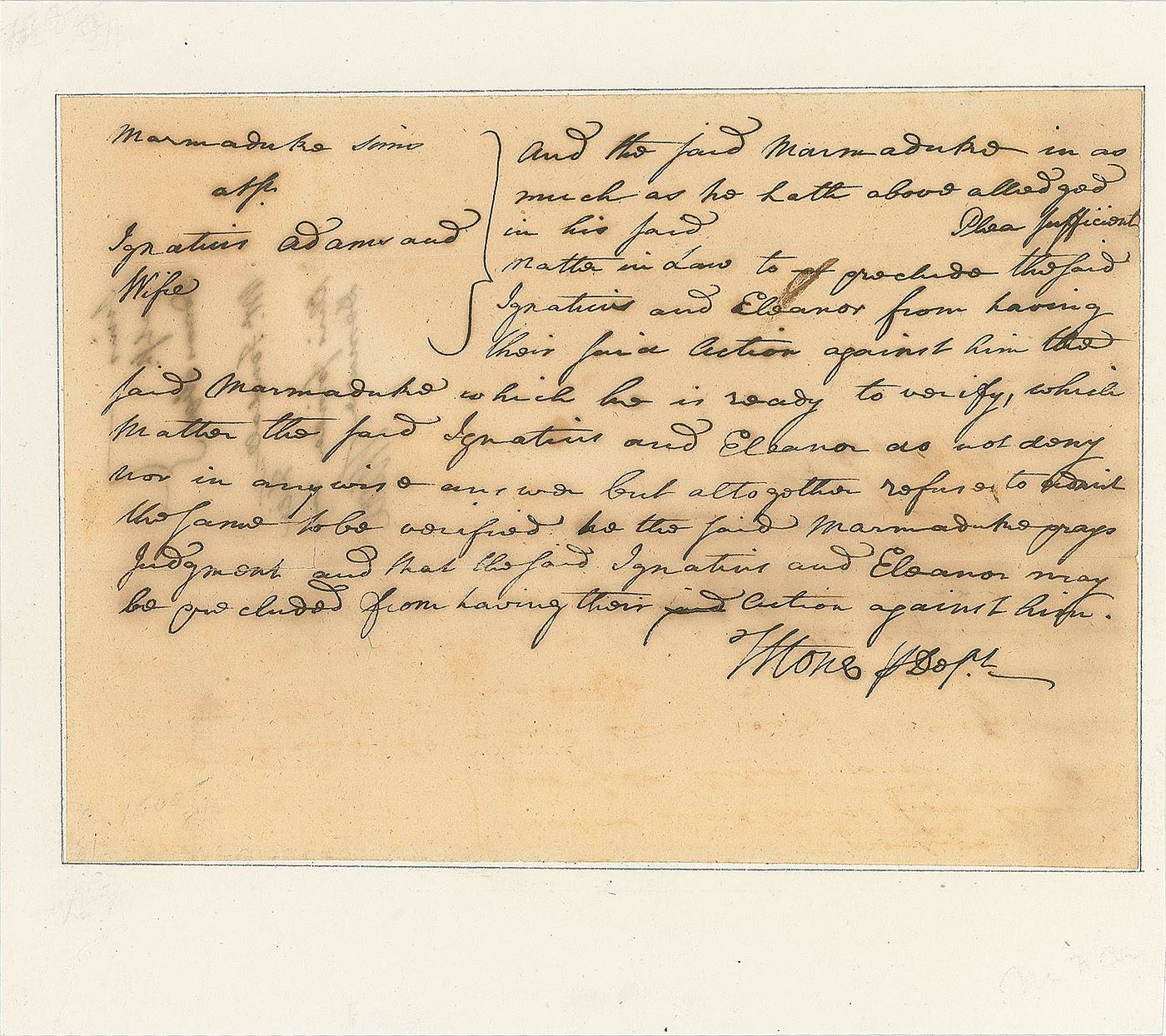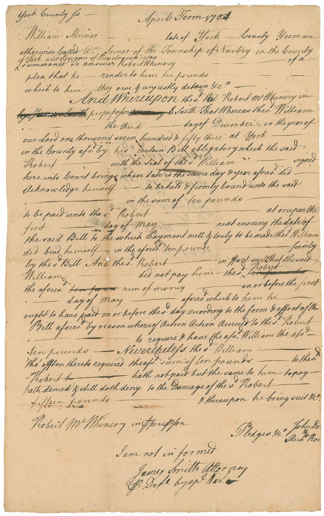 ADS signed “James Smith Attorney, Def’t by sp’l Wart.,” one page, 7.75 x 12.25, April 1754. A lengthy legal document in the case of Robert M. Whinery v. William Shriner, beginning: “William Shriner late of York County Yeoman otherwise called Wm. Srinot of the Township of Newbry in the Country of York…was summoned to answer Robert Whinery of a plea that he render to him ten pounds which to him they owe & unjustly detain.” In fine condition, with a few small tape repairs to reverse. Accompanied by a full letter of authenticity from JSA.