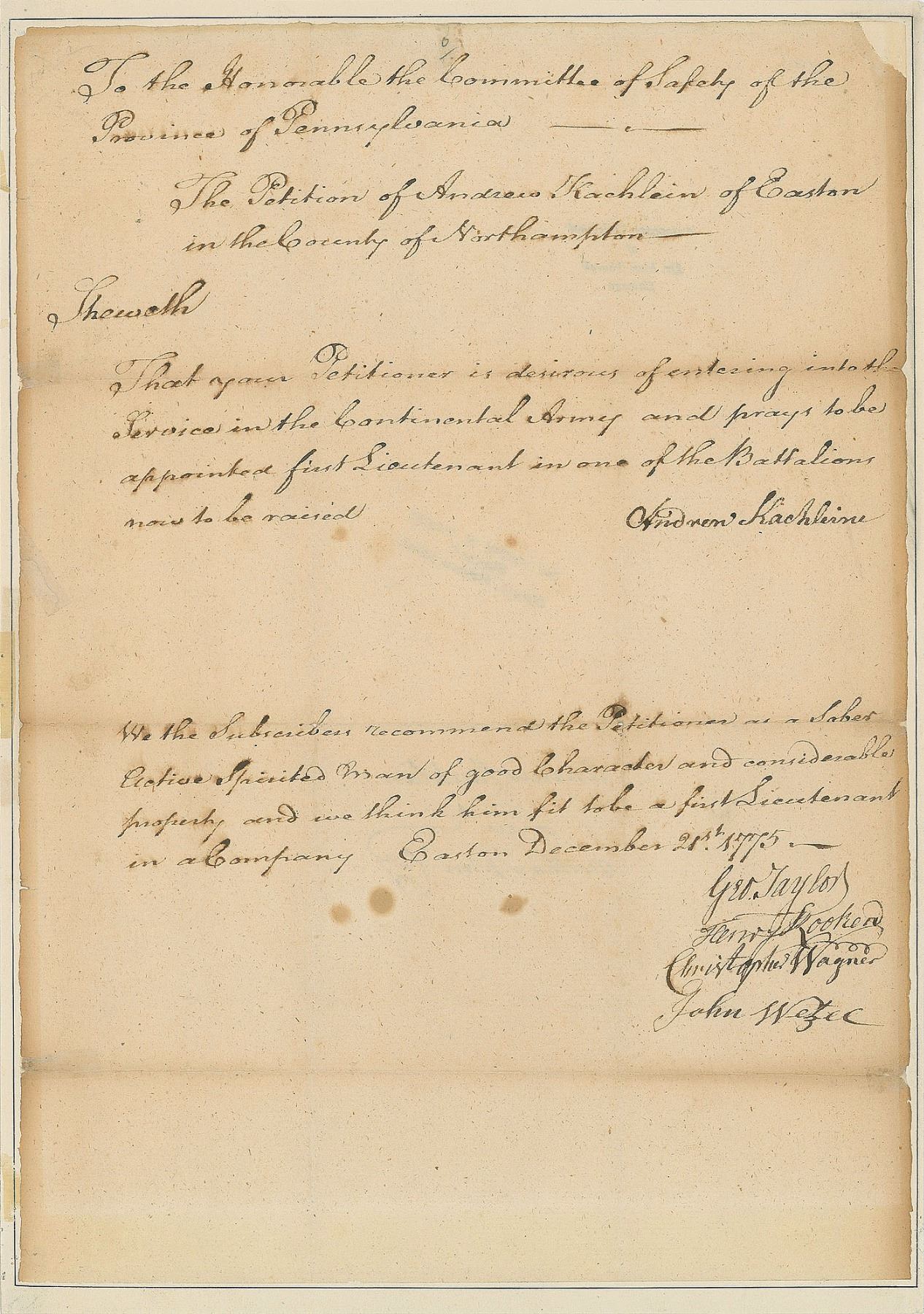 Revolutionary War–dated manuscript DS, signed “Geo. Taylor,” one page, 8.25 x 11.75, December 21, 1775. Document headed, “To the Honorable the Committee of Safety of the Province of Pennsylvania—The Petition of Andrew Kachlein of Eason in the County of Northampton.” The petition, signed “Andrew Kachleine,” reads: “Showeth, That your Petitioner is desirous of entering into the Service in the Continental Army and prays to be appointed first Lieutenant in one of the Battalions now to be raised.” Below is a statement supporting the petition, “We the Subscribers recommend the Petitioner as a Sober Active Spirited man of good Character and considerable property and we think him fit to be a first Lieutenant in a Company,” endorsed below by George Taylor, Henry Looker, Christopher Wagner, and John Wetzel. Professionally inlaid into a slightly larger sheet. Reverse bears an ink stamp, “Autograph Collection of Dr. Max Thorek, Chicago.” In fine condition, with toning and light chipping to edges. Accompanied by a full letter of authenticity from JSA.