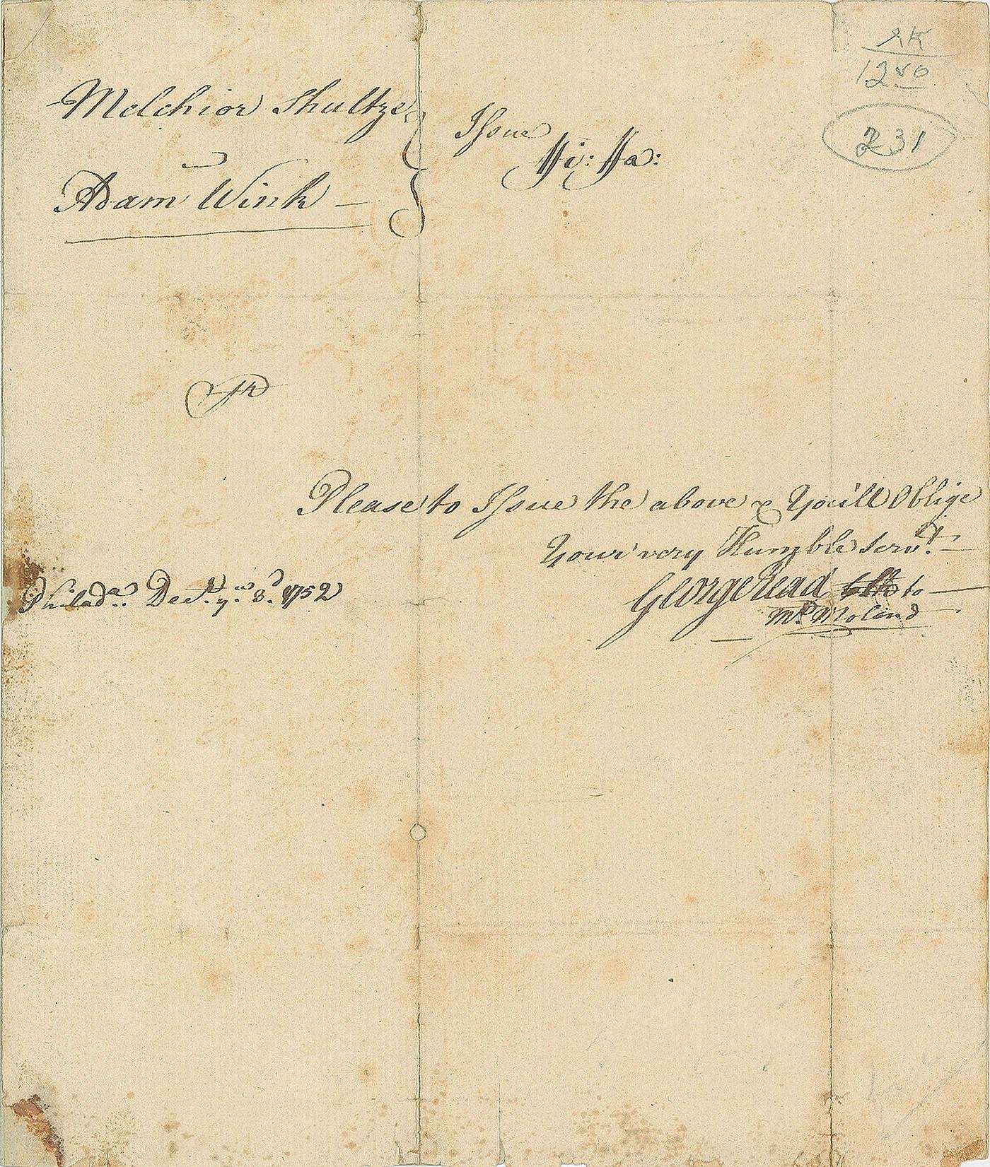 Early autograph ink endorsement signed “George Read,” one page, 6.5 x 7.75, December 3, 1752. Docket of a leaf which once contained a legal document concerning the case of Melchior Schultze & Adam Wink. The endorsement, penned by a 19-year-old Read, in full: “Please to Issue the above & You’ll Oblige, Your very Humble Serv’t, George Read Clk to Mr. Molland.” In very good to fine condition, with scattered light staining, and repairs to fold splitting and small areas of paper loss. A desirable pre-Revolutionary example.