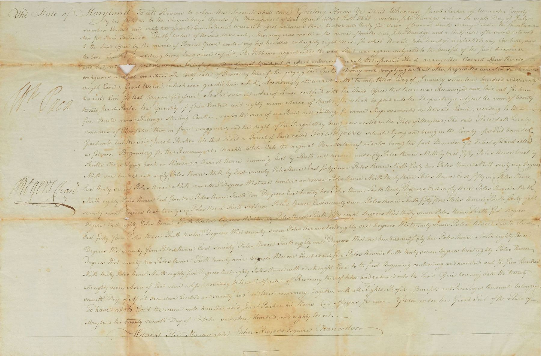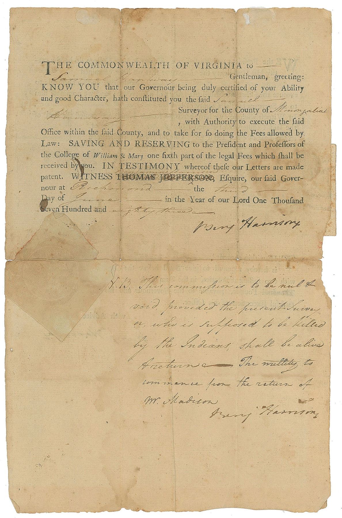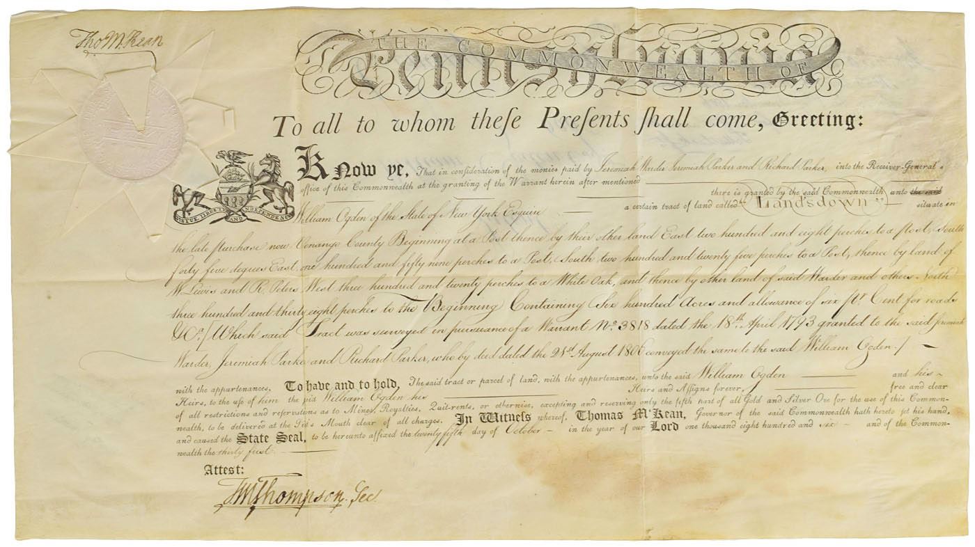 Partly-printed vellum DS, signed “Tho. M:Kean,” one page, 20.5 x 11.75, October 25, 1806. As governor of Pennsylvania, McKean grants William Ogden "a certain tract of land, called 'Landsdown' situate in…Venango County…containing Six hundred Acres." Boldly signed in the upper left corner by Governor McKean. Also signed on the reverse by Timothy Matlack, the engrosser of the Declaration of Independence. The crisp white paper seal remains affixed to the upper left. In very good to fine condition, with moderate intersecting folds and areas of light staining.