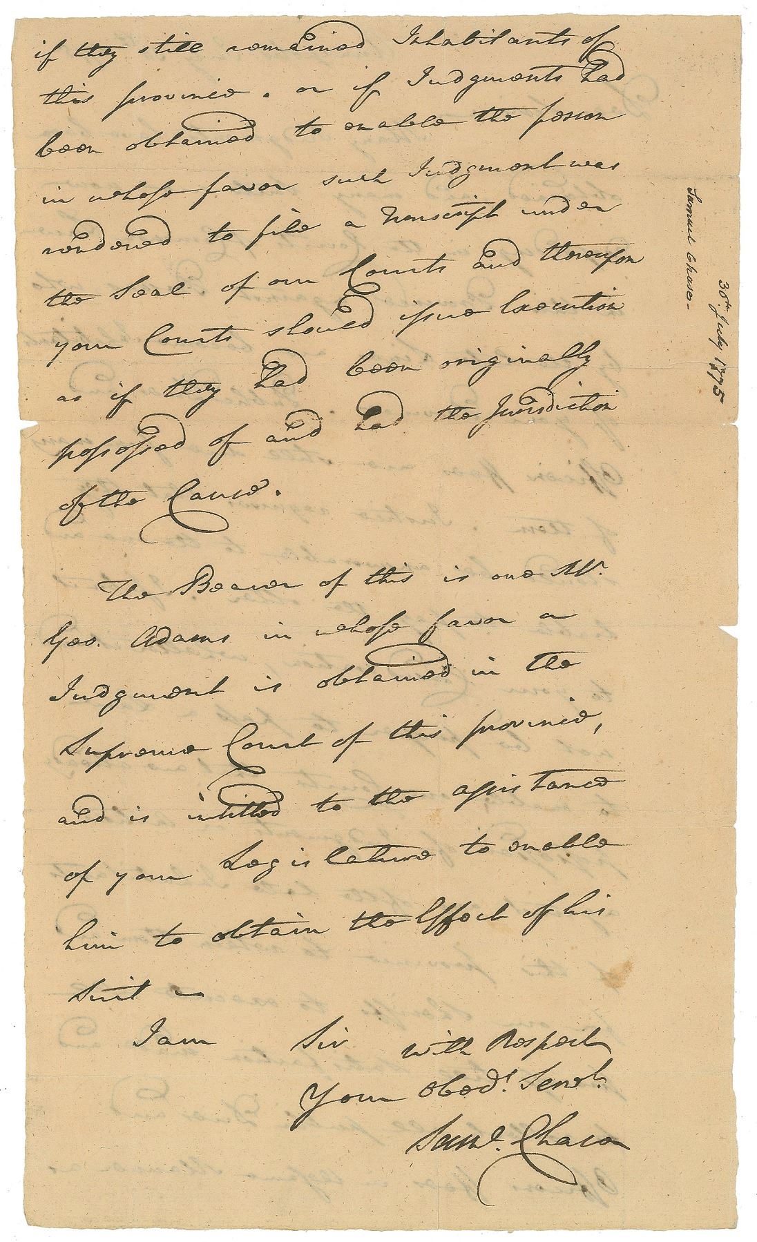 Ink signature, “Samuel Adams,” on an off-white 5 x 1.75 slip, with a partial manuscript passage on the reverse dated July 7, 1794. In very good condition, with heavy uniform toning, archival tape repairs on the reverse, show-through from writing to reverse, and chipping to edges; the signature remains crisp and bold.
