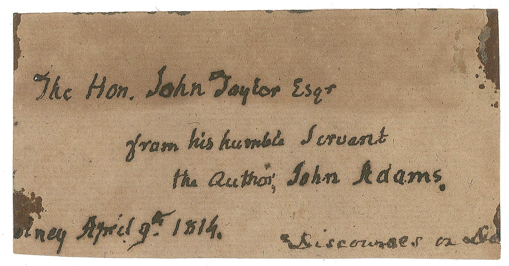 Bold ink signature and inscription, “The Hon. John Taylor, Esqr., from his humble servant, the author, John Adams, April 9th, 1814,” on an off-white 4 x 2 slip, marked “Discourses on D” in another hand. In very good to fine condition, with trimmed edges, a block of toning to the top, and ink blots to edges. Accompanied by an engraved portrait. This was apparently clipped from the flyleaf of a presentation volume of Adams’s 1790 book Discourses on Davila, a work of political philosophy in defense of the US Constitution.