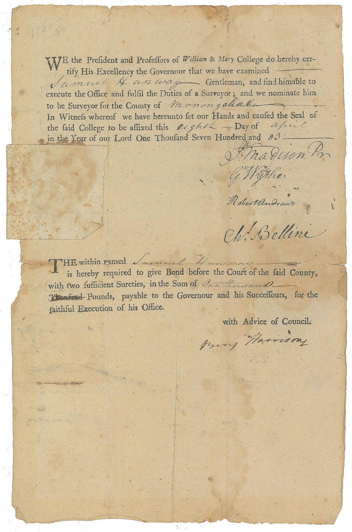 DS, endorsed twice on the reverse, “Rob’t Paine his att’y,” three pages on two sheets, 9 x 12.5, February 24, 1794. Document in which the sheriff of Suffolk County is commanded to bring Stephen Fales of Boston before the court to respond to a complaint made by William Clapp. Endorsed twice on the reverse by Paine as Fales’s defense attorney. In good condition, with irregularly trimmed edges, repaired separations, and tears and toning to folds.